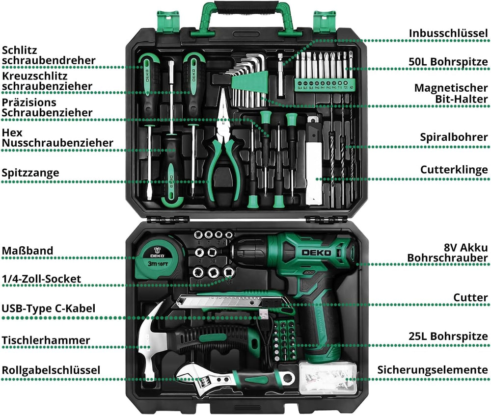 - Der hochwertige und langlebige DEKO Werkzeugkasten besteht aus hochwertigem CR-V Chromstahl, um Korrosion und Oxidation zu verhindern. Abgedeckt von einem stabilen Gummigriff für bessere Kontrolle.