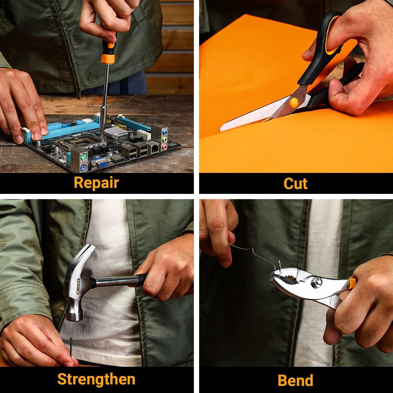 - Lieferumfang: 8 professionelle Sechskantschlüssel, Gleitgelenkzange, 30 Bits, Bit-Schraubendreher, 4 Präzisions-Schraubendreher, Universalschneider, Kastenverschlüsse, 3 m Massband, Schere, Klauenhammer und magnetischer Bithalter.