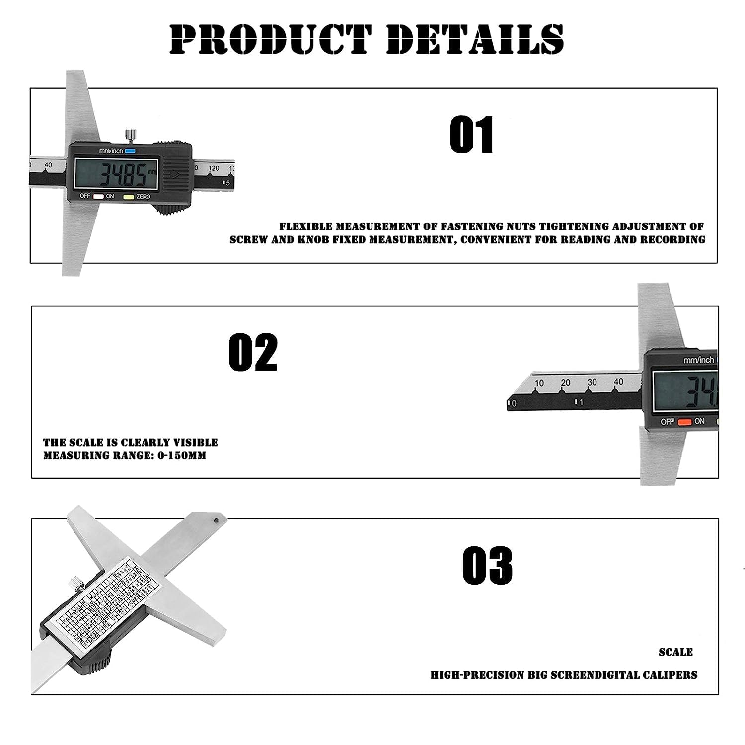 - Vielseitig --- Kalibrieren Sie die Innen-, Aussen-, Tiefe und Schritt mit zwei Sätzen von Backen und einer Sonde als Messschieber