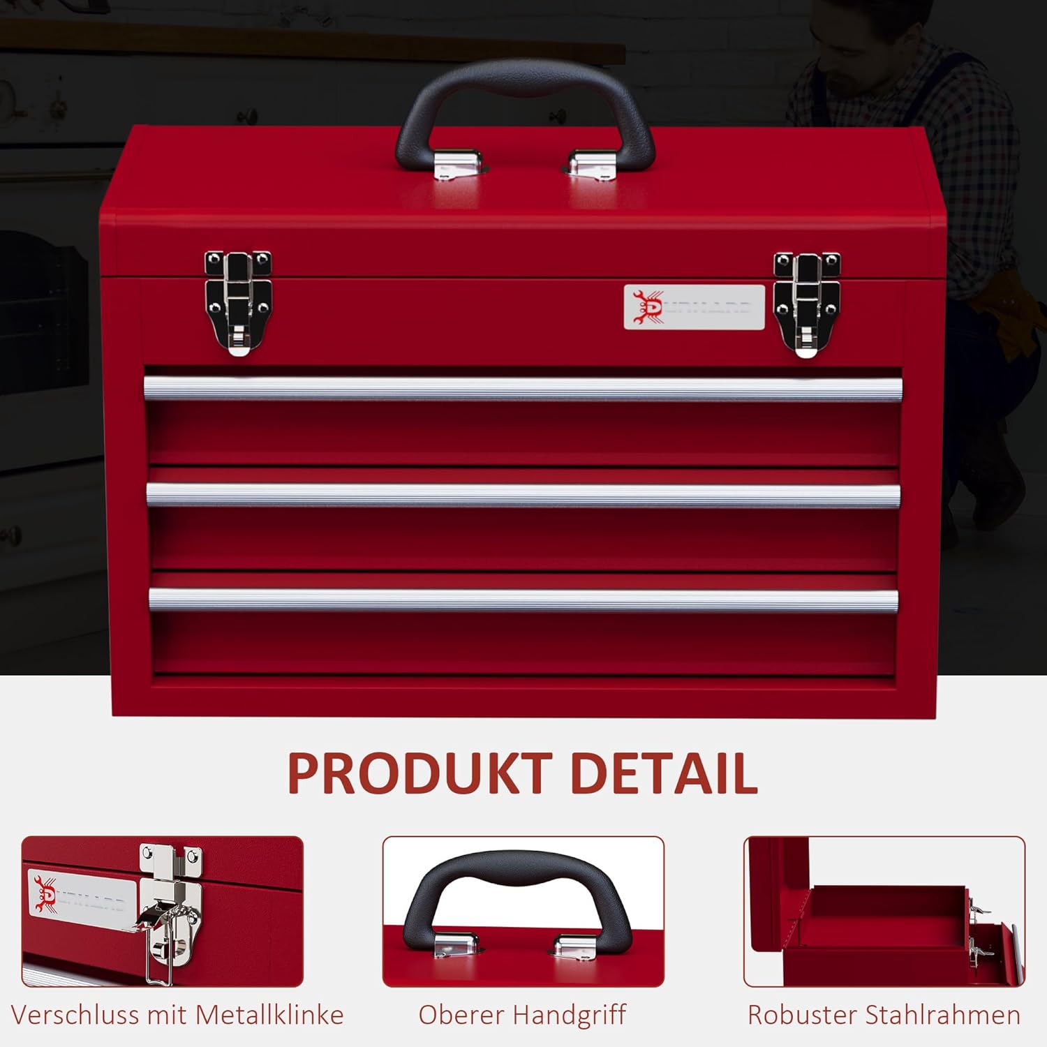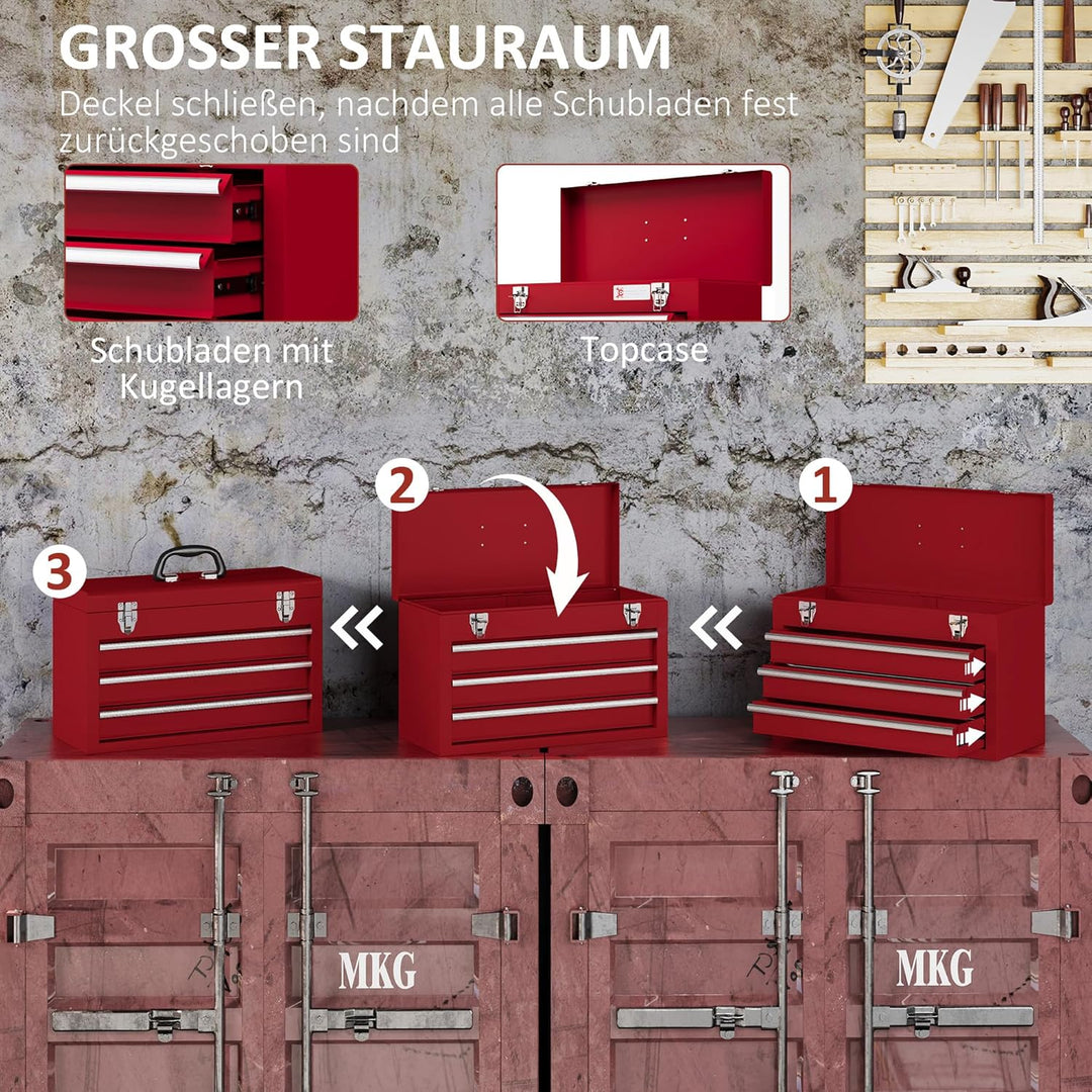 - Gleitschubladen mit Kugellager: Drei geräumige Schubladen bieten reichlich Platz für Ihre Werkzeuge. Dank der Gleitschienen öffnen und schliessen sie mühelos. Zusätzlich bietet der obere Werkzeugkasten weiteren Stauraum für Ihre Ausrüstung.
