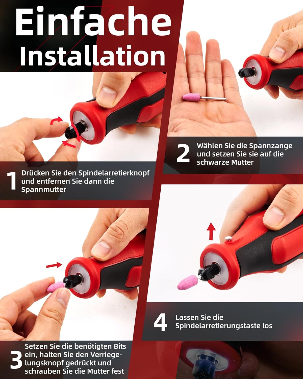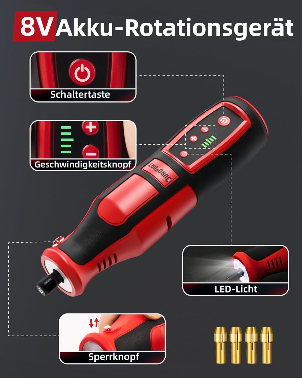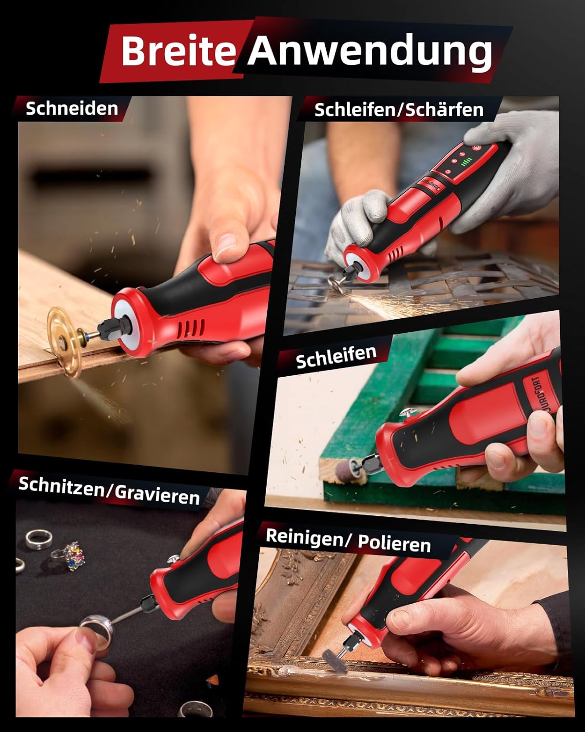 - 5 Gang Rotationswerkzeug,Flexible Geschwindigkeitsregelung: Ausgestattet mit 5 einstellbaren Geschwindigkeitsstufen (17000-32000 U/min), ermöglicht die einstellbare Geschwindigkeit die Wahl der richtigen Geschwindigkeit für verschiedene Materialien.