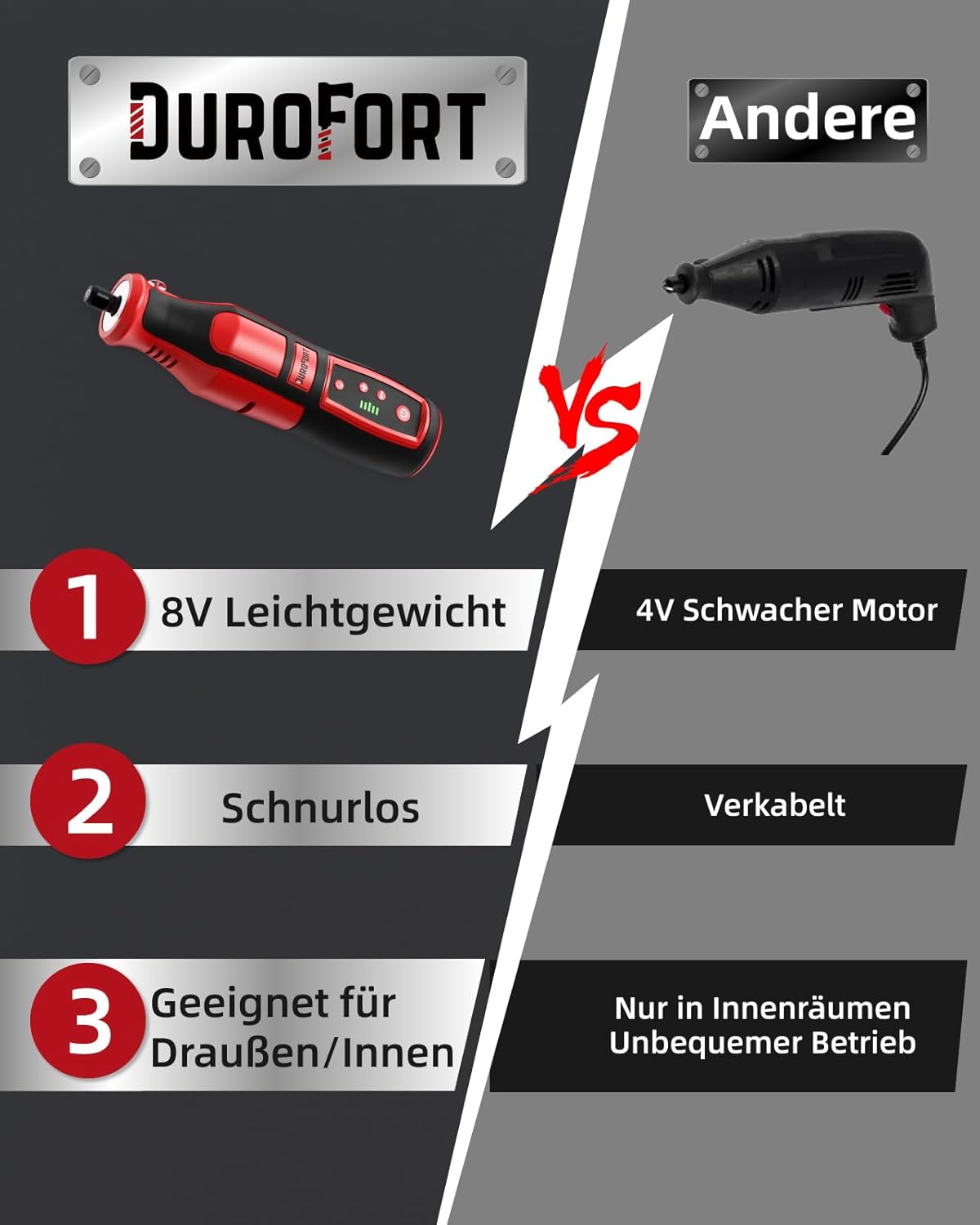 - LEISTUNGSFÄHIG UND KOMPAKT: Der DuroFort Akku Multifunktionswerkzeug Gravierstift mit 8V-Motor bietet mehr Leistung als das 4V-Modell, aber sein kleineres und leichteres Design macht es einfach, mit einer Hand für eine Vielzahl von Aufgaben zu bedienen.