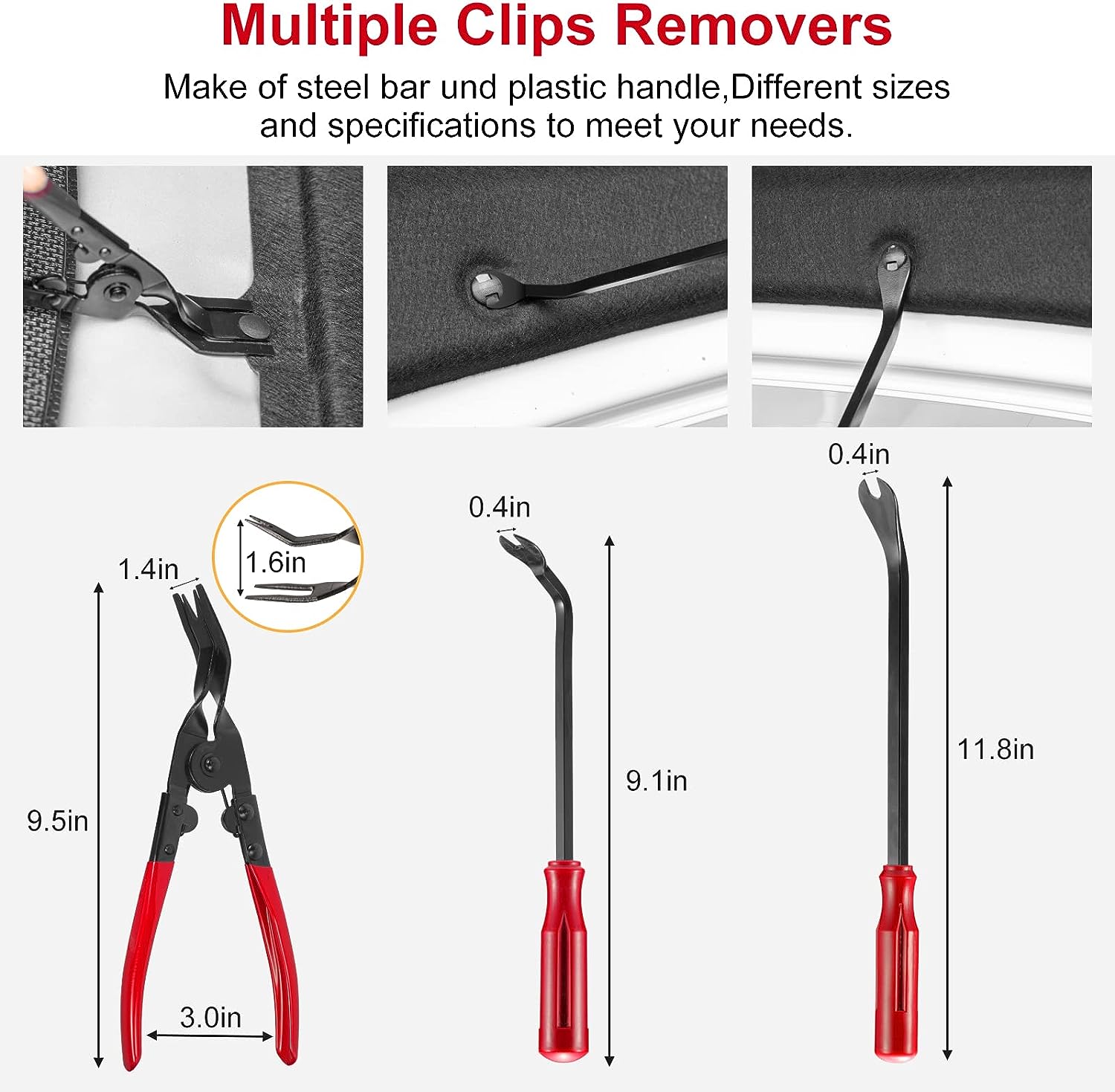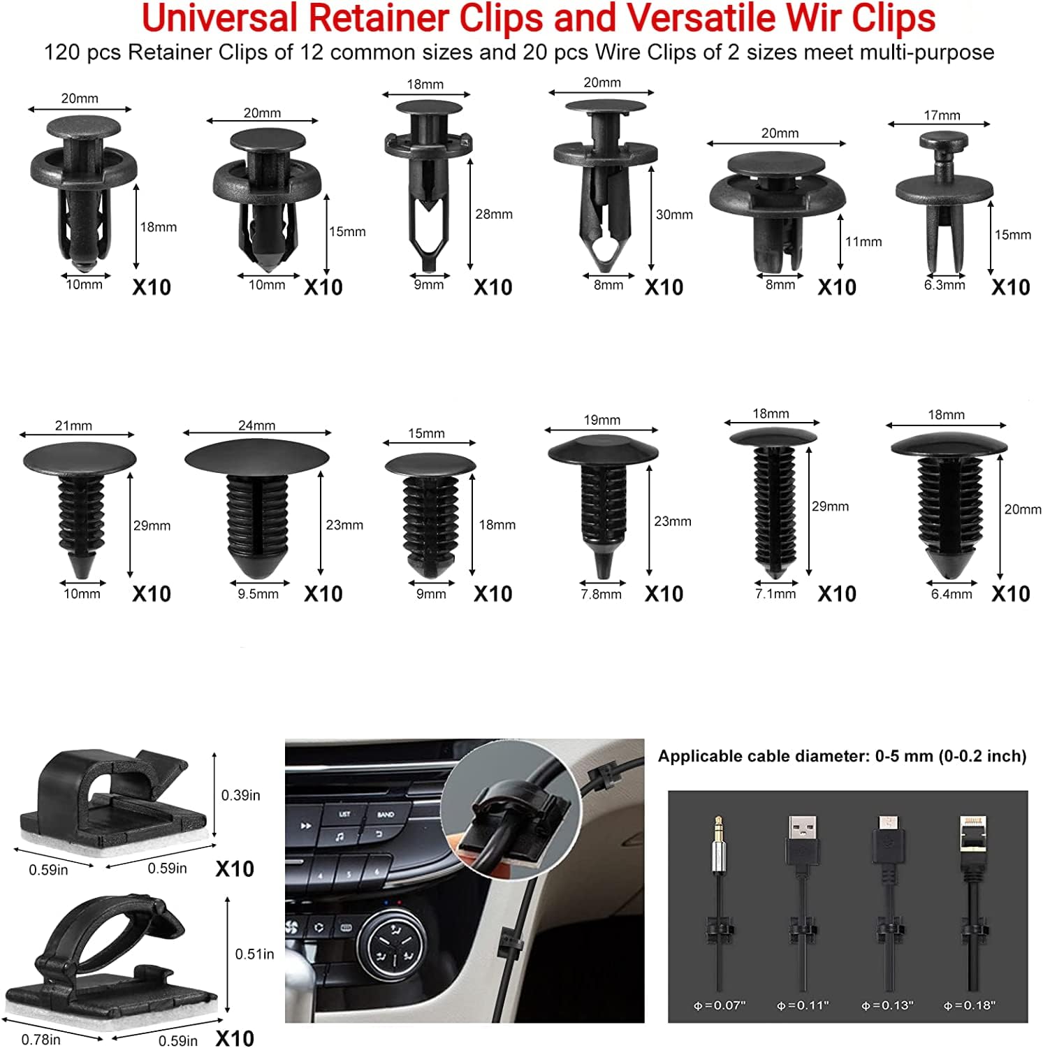 - [330-teiliges Auto Demontage Werkzeuge]: einschliesslich 11 x Entfernungswerkzeuge, 2 x Werkzeug zum Lösen von Clips, 1 x Zange zum Entfernen von Clips, 120 x Auto Befestigung Clips, 20 x Kabelclips, 11 x Werkzeug zum Entfernen von Kabelanschlüssen, 6