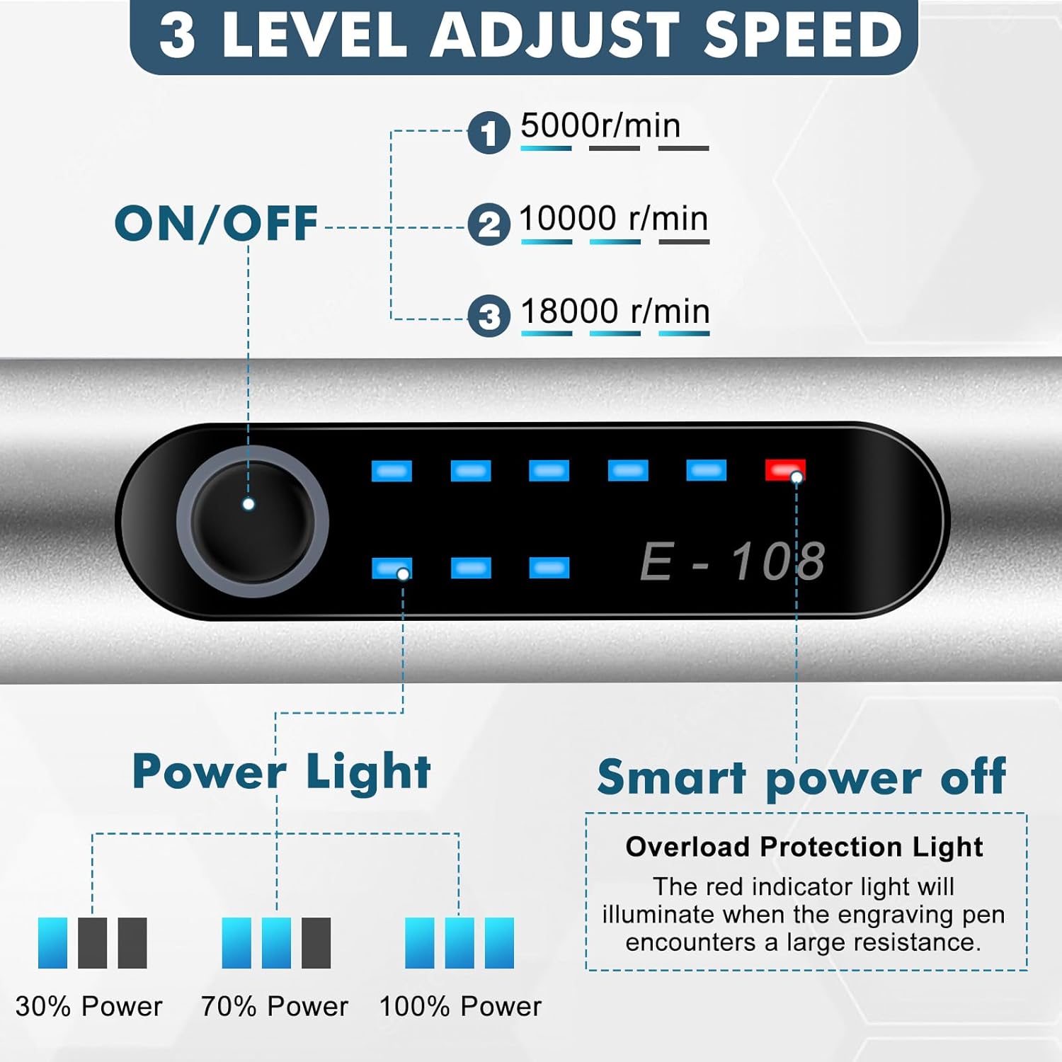 - 【Sichtbare Geschwindigkeitseinstellung】 Der Multifunktion Gravierstift verfügt über einen hochwertigen Motor mit 3 einstellbaren Drehzahlen von 5 000 bis 10 000 bis 18 000 r/min, Sie können die Arbeitsgeschwindigkeit für unterschiedliche
