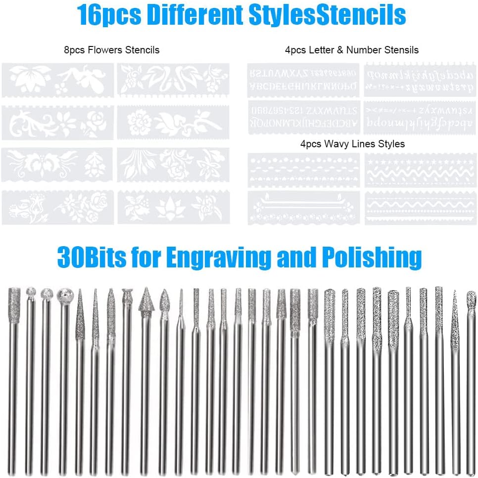- [Verschiedene Schleifbits] DIY-Gravierwerkzeuge umfassen 1 Stück Gravierstift, 30 Stück Drehbits, 2 Bohrer (1 m, 1,5 mm), 3 Edelstahl-Trennscheiben (20mm, 23mm, 30mm), 3 Sägeblätter (22 mm, 25 mm, 32 mm), 2 Stück 35mm Schaftpfosten. All diese Bits