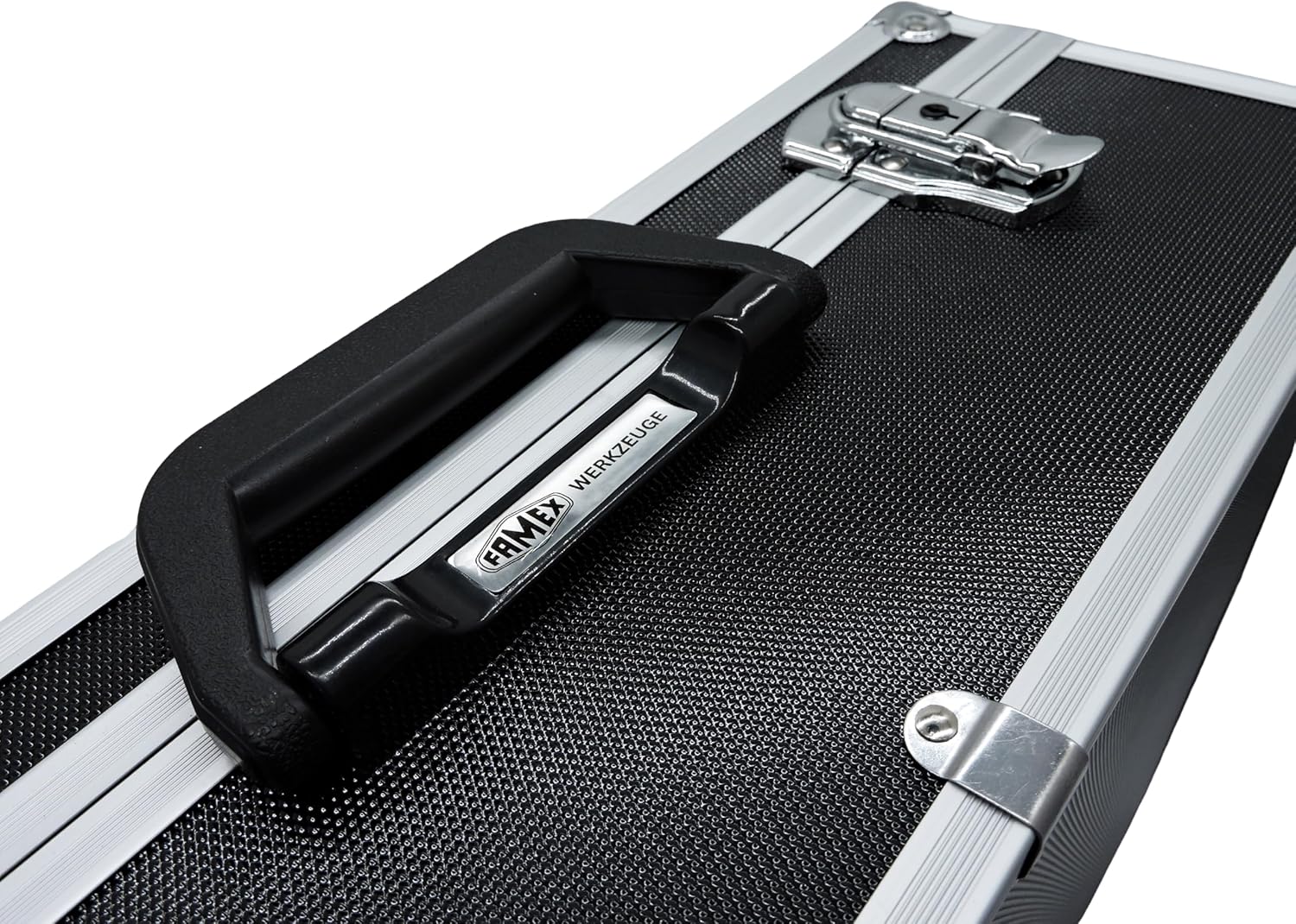 - FAMEX QUALITÄT - Alle Schraubwerkzeuge sind aus Chrom-Vanadium-Stahl. Die Steckschlüsseleinsätze sind matt-verchromt. Schraubenschlüssel aus CV-Stahl geschmiedet, Klingen der Schraubendreher aus CV-Stahl mit schwarzen Spitzen. Die Schneiden der