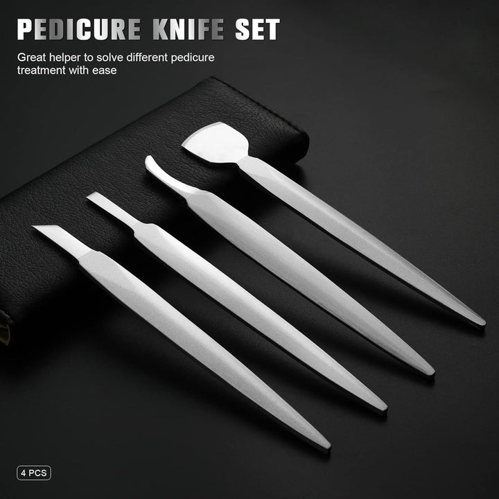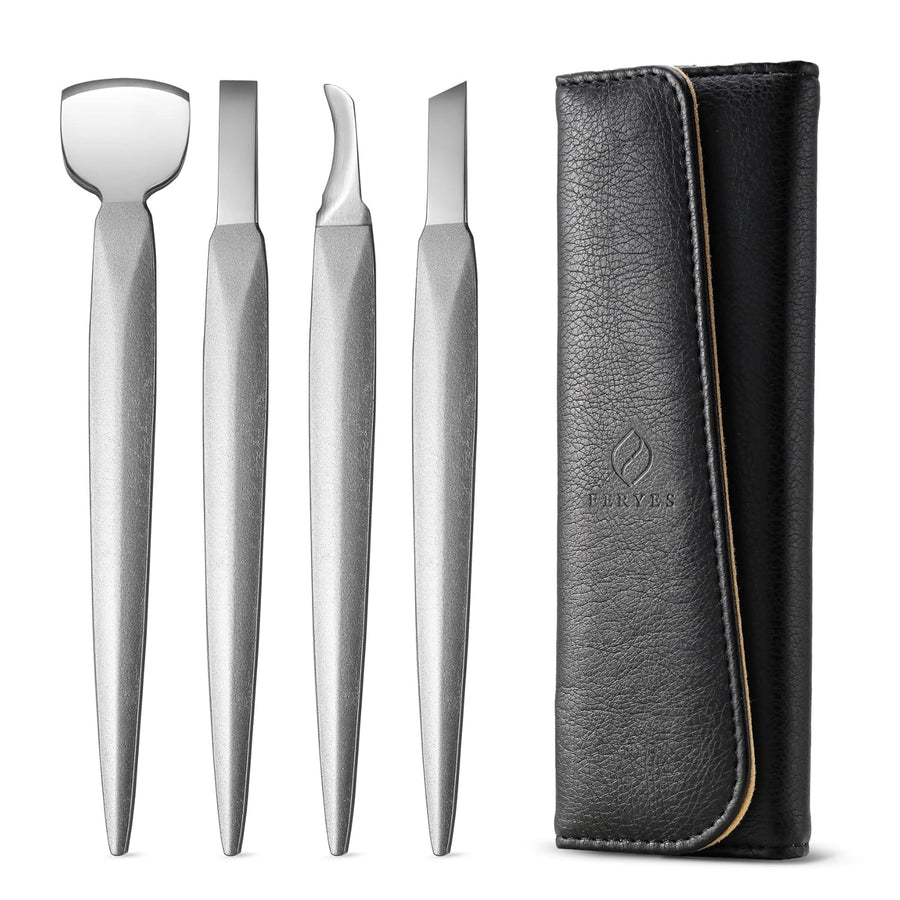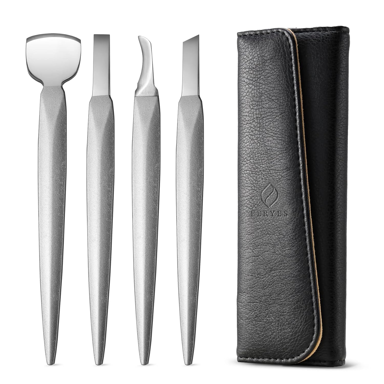 - 4-teiliges leistungsstarkes Pediküre-Werkzeug-Set: Das Feryes Pediküre-Werkzeugset verfügt über vier leistungsstarke Zehennagel-Pflegewerkzeuge, darunter ein weit gebogenes Messer, ein schräges Messer, ein flaches Messer, ein Streifenmesser
