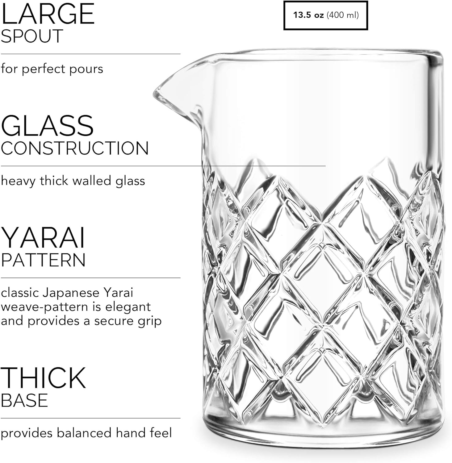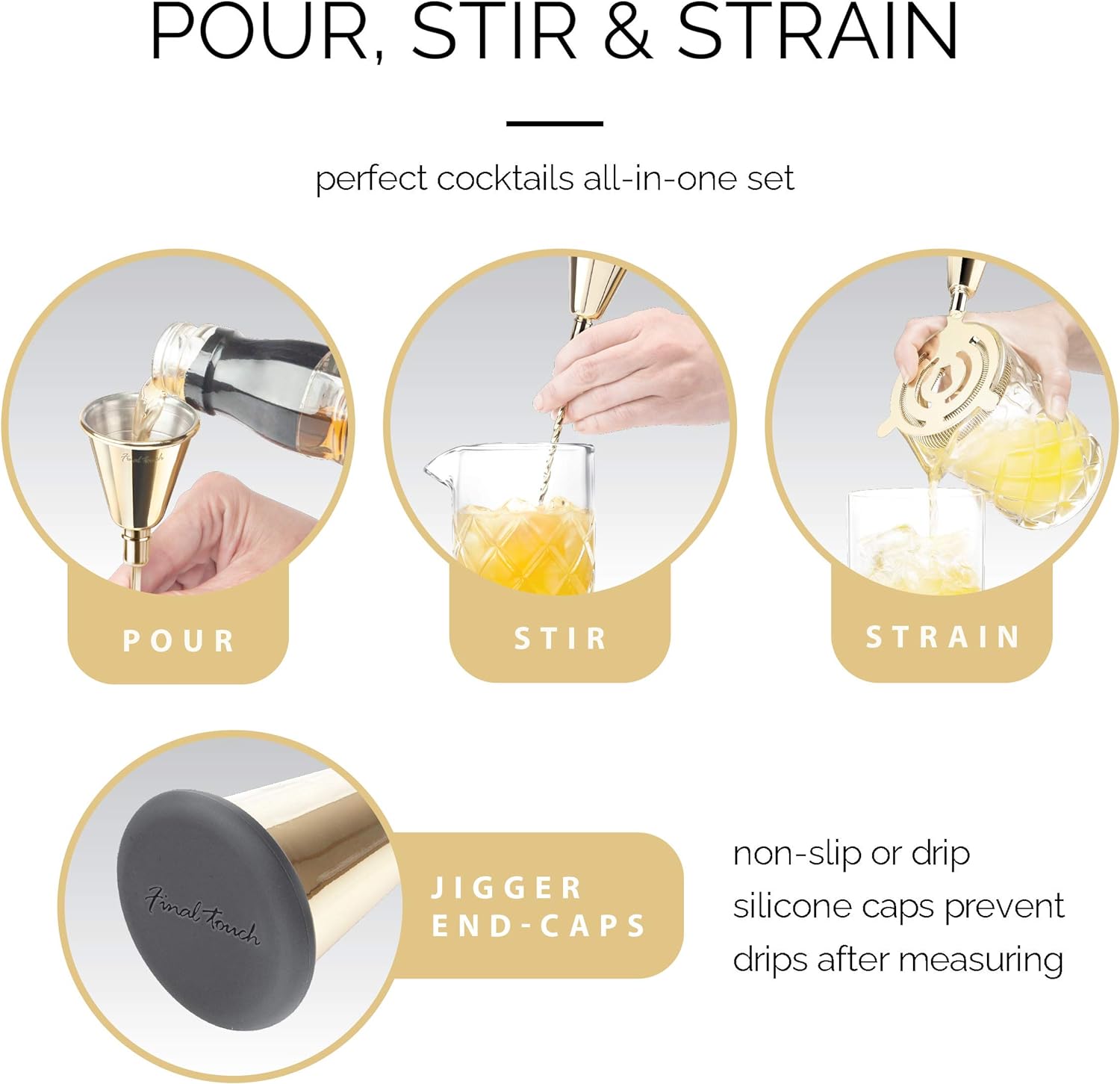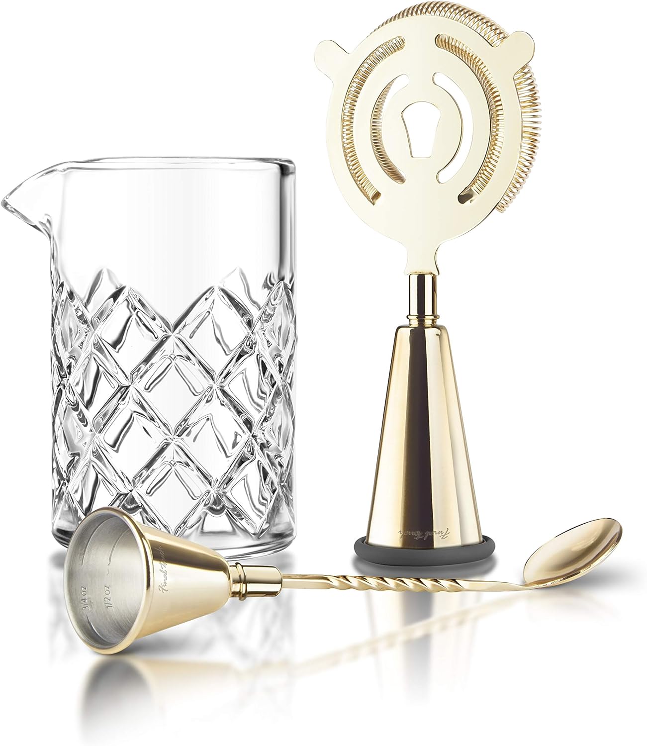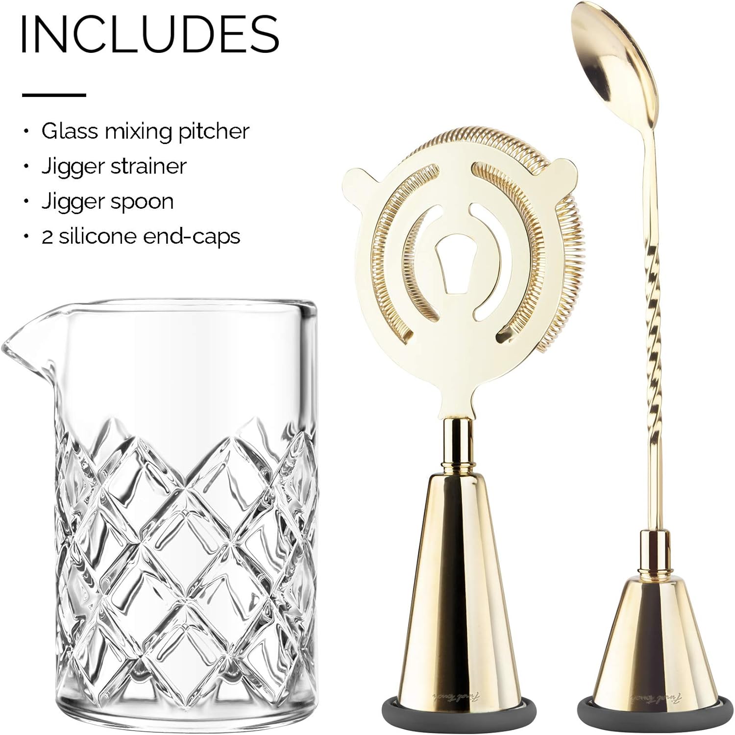 - Enthält: Glas-Mixkrug, Jigger Sieb, Jigger Löffel und 2 Silikon-Endkappen