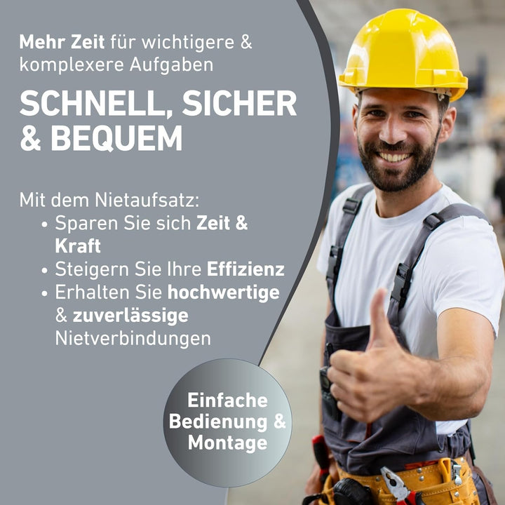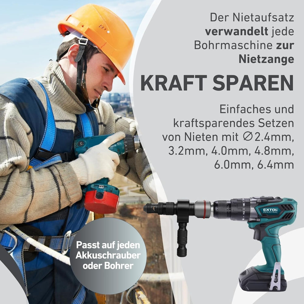 - KRAFTSPAREND - Dieser professionelle Nietpistolen-Adapter-Kit verwandelt jeden Akkuschrauber in eine kräftige Popnietenzange mit der Sie einfach, schnell und kraftsparend Blindnieten in den Grössen: 2,4mm; 3,2mm; 4,0mm; 4,8mm; 6,0mm; 6,4mm setzten können.