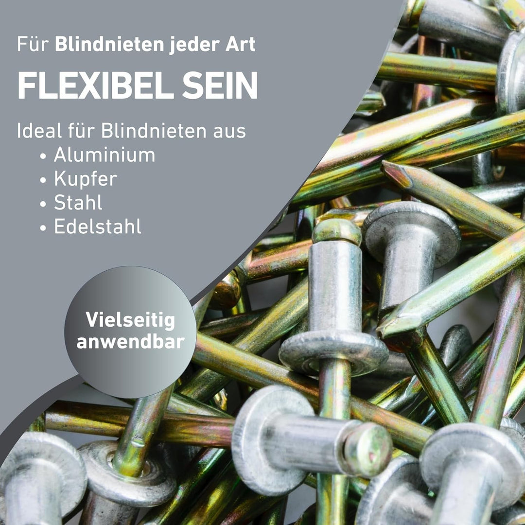 - STARK - Dank des integrierten Griffs kann mit der Blindnietzange auch grössere und stärkere Nieten bis 6,4mm verarbeitet werden. Der Griff erhöht den Komfort, da er die Auswirkungen der Torsionskraft besser zu bewältigen sind.