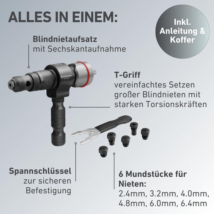 - INKL - 1x Nietadapter für Akkuschrauber oder Bohrmaschine, 6x Mundstücke für Nietengrössen: 2,4mm; 3,2mm; 4,0mm; 4,8mm; 6,0mm; 6,4mm, 2x Spannschlüssel, 1x Betriebsanleitung, 1x handlicher Kunststoffkoffer