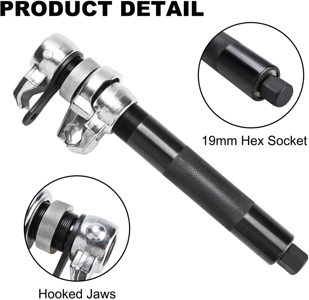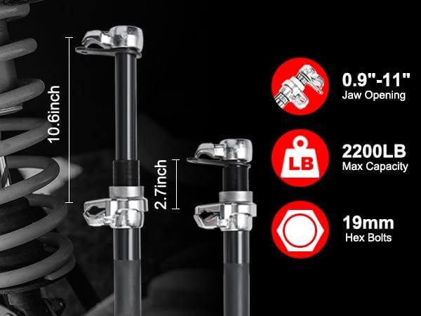 - Anwendungsbereich: Das Spiralfeder-Kompressionswerkzeug mit einer breiten Backen-Kapazität von 23 mm bis 280 mm und einer Tragfähigkeit von 1,2 Tonnen (1200 kg/2645 lb) eignet sich optimal für verschiedene Fahrzeugtypen. Es minimiert das Verbiegen,