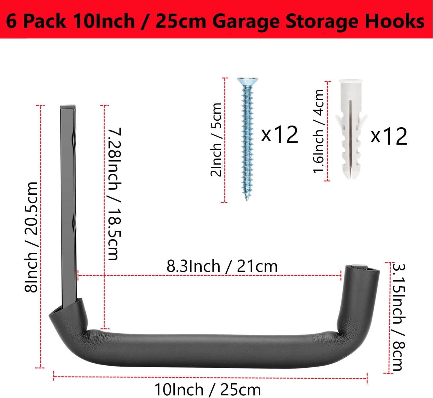 - Lieferumfang: 6 Stück Garagen-Aufbewahrungshaken, Grösse: 25,4 x 20,3 cm (L x H), Innenbreite: 21,6 cm, mit 12 Stück 5,1 cm Schrauben und 12 Kunststoffankern. Und Sie können zwei Leiteraufhänger als Streichholz verwenden, um schwere Gegenstände