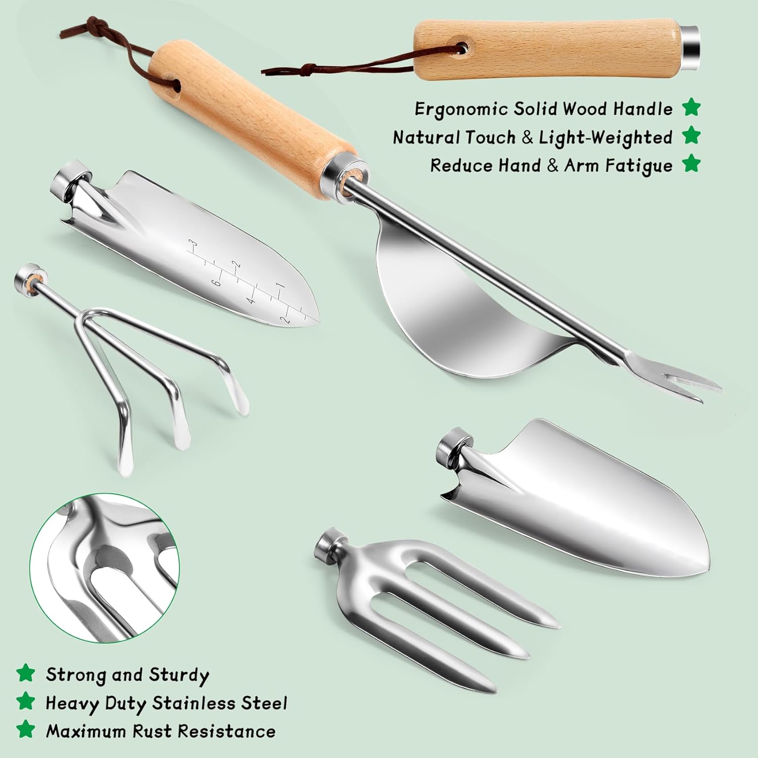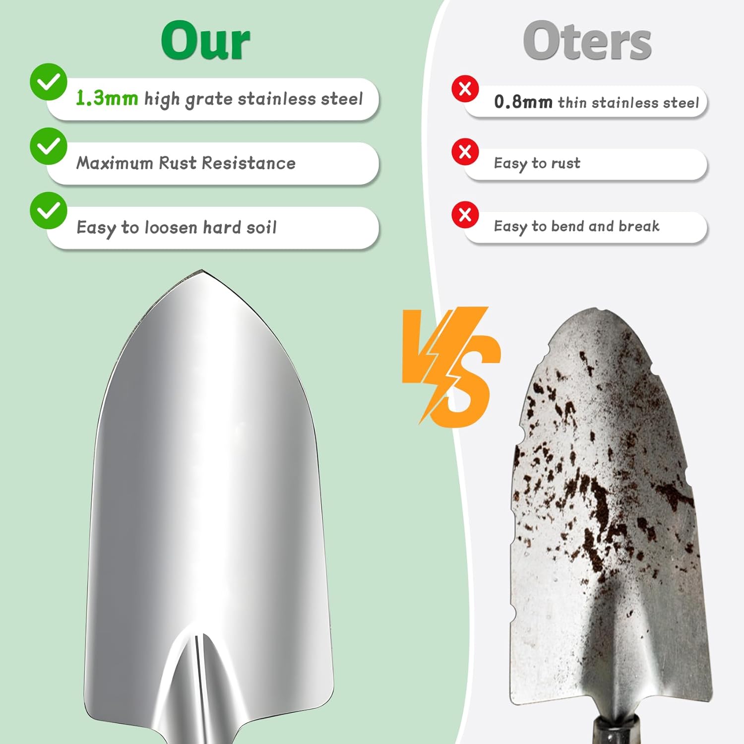 - 【 Langlebiges Edelstahldesign】Das Gartenwerkzeug set besteht aus langlebigem Edelstahl, der glatt, rostfest, langlebig ist, nach Gebrauch nicht leicht zu brechen, leicht zu reinigen und hat eine hohe Härte und Haltbarkeit. Diese Gartengeräte sind
