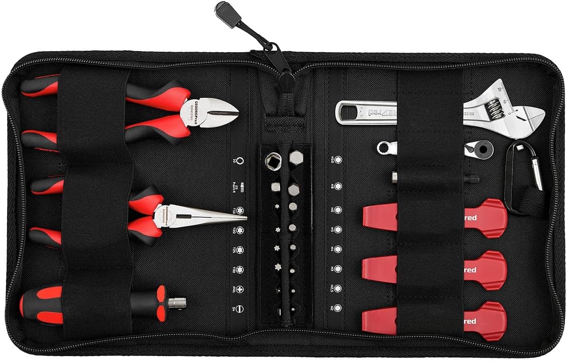 - PRAKTISCHE HANDHABUNG: Sie haben die grosse Auswahl an qualitativ hochwertigem Werkzeug stets griffbereit, dank der handlichen Tasche mit Aufhänger. Die ergonomische Bit-Knarre erleichtert die Arbeit.