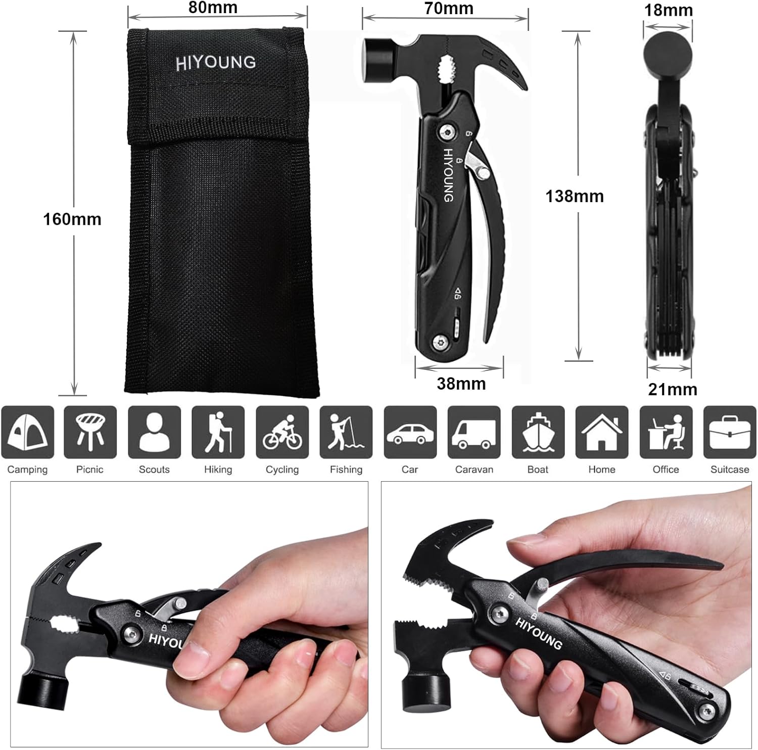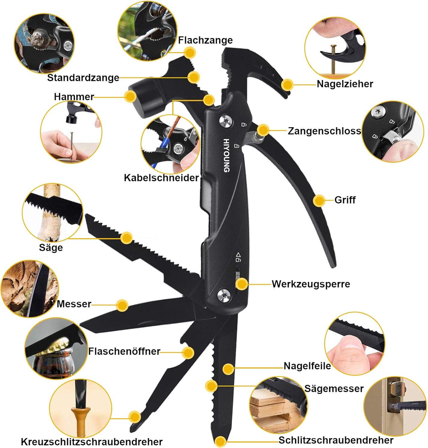 - 【Breite Anwendungen】 Must-have-EDC-multitool, ideal für camping, renovierung, heimwerkerarbeiten. Kann schneiden, einen nagel hämmern, hebeln, die schraube drehen, holz sägen, hydranten öffnen. Der multifunktionale werkzeughammer ist praktisch