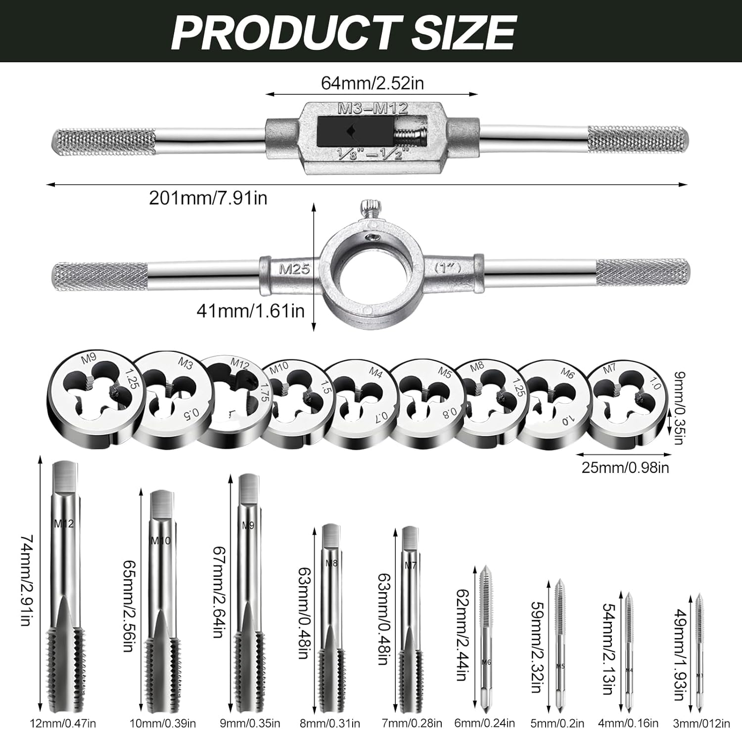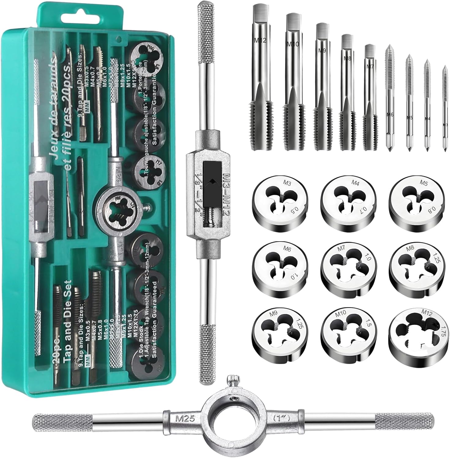 - 20 Tlg Gewindebohrer Set -- Unser Schneideisen Set enthält 9 Innengewinde und 9 Aussengewinde (1 von jeder Grösse), Gewindeschneidsatz Metrisch: M3 x 0,5, M4 x 0,7, M5 x 0,8, M6 x 1,0, M7 x 1,0, M8 x 1,25, M9 x 1,25, M10 x 1,5, M12 x 1,75 mm, Kommt mit