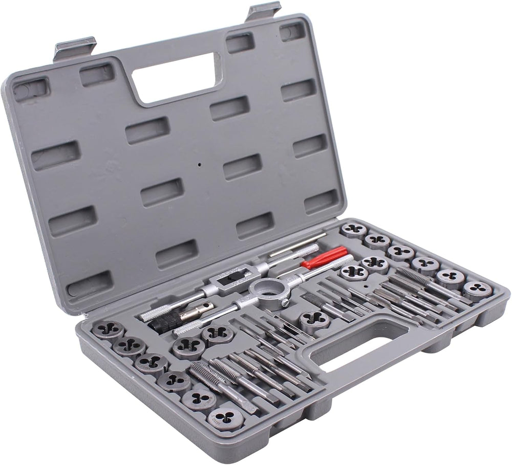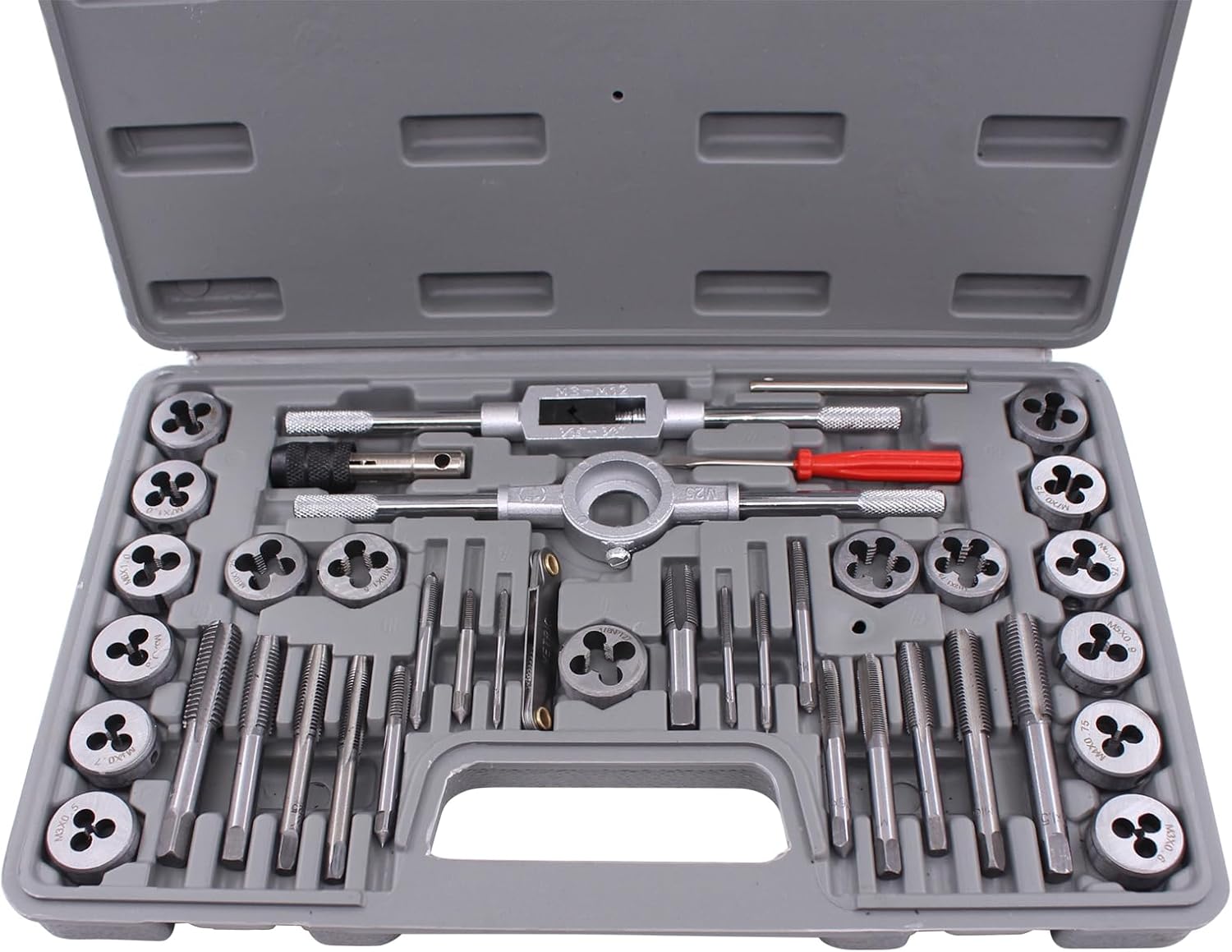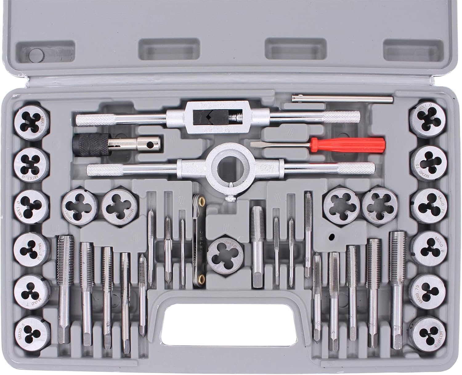 - Lieferumfang : 1 x Windeisen für Gewindebohrer M3-M12; 1 x Schneideisenhalter für Schneidplatten M25; 1 x Werkzeughalter M3-M5; 1 x Gleitgriff; 1 x Schlitzschraubendreher; 1 x Gewindelehre 12 Blatt; 17 x Gewindebohrer je 1x (M12x1,5, M12x1,75,