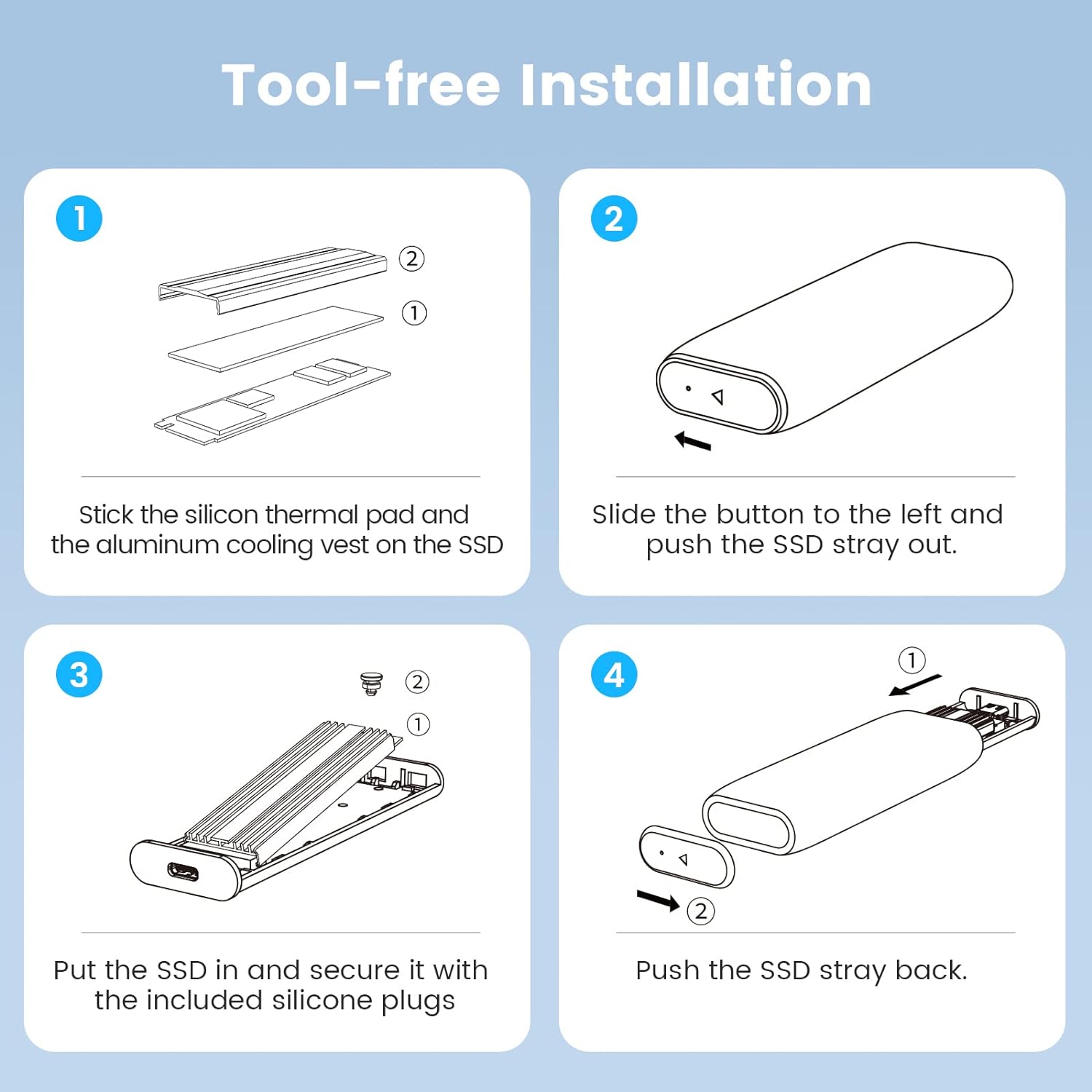 - 【Werkzeugfreie Installation】Diese M2 SSD gehäuse verwendet Werkzeug kostenlose SSD Tablett -Installationsmethode, um die Installation schneller und bequemer zu gestalten. Kein Treiber ist erforderlich, Plug and Play. Es verfügt über einen