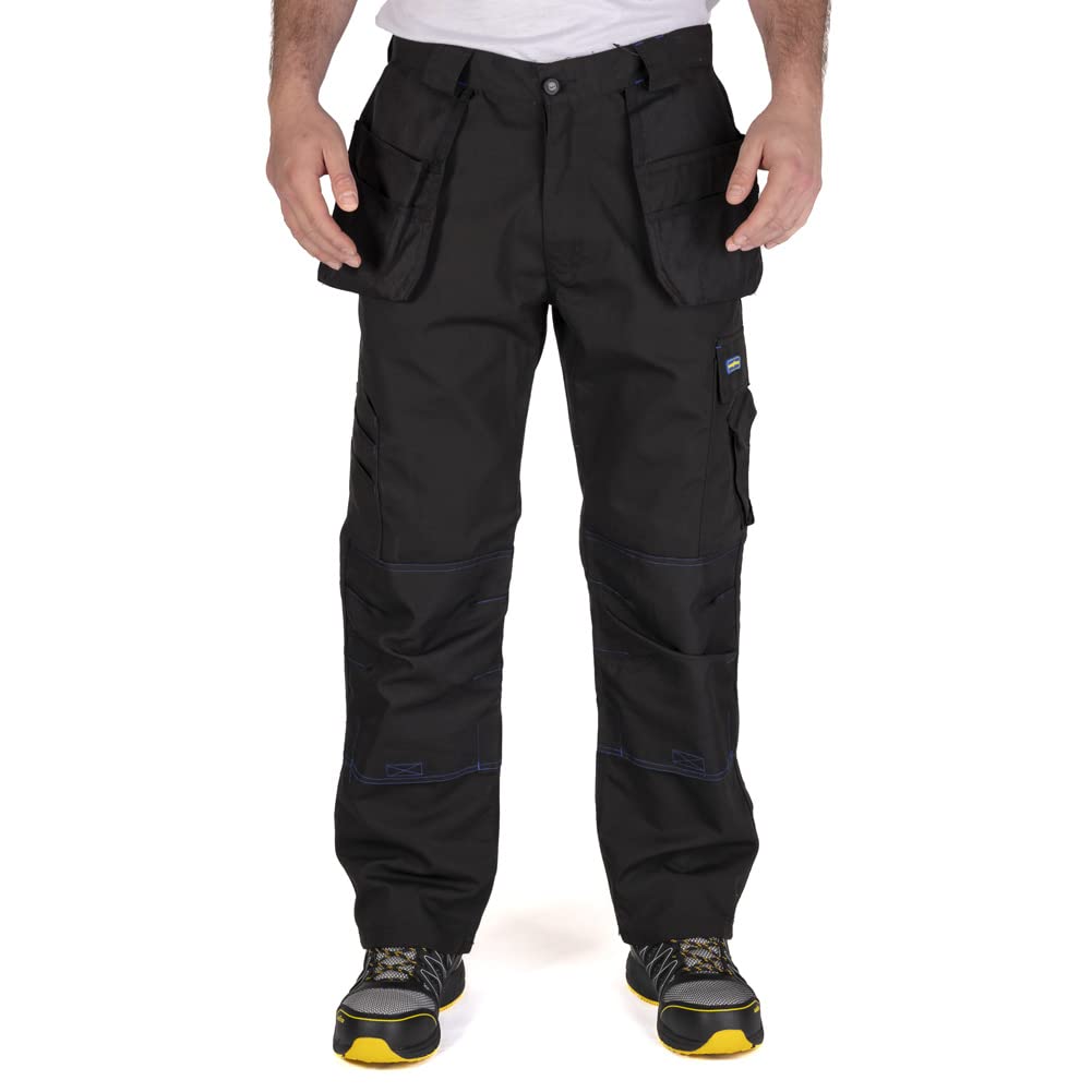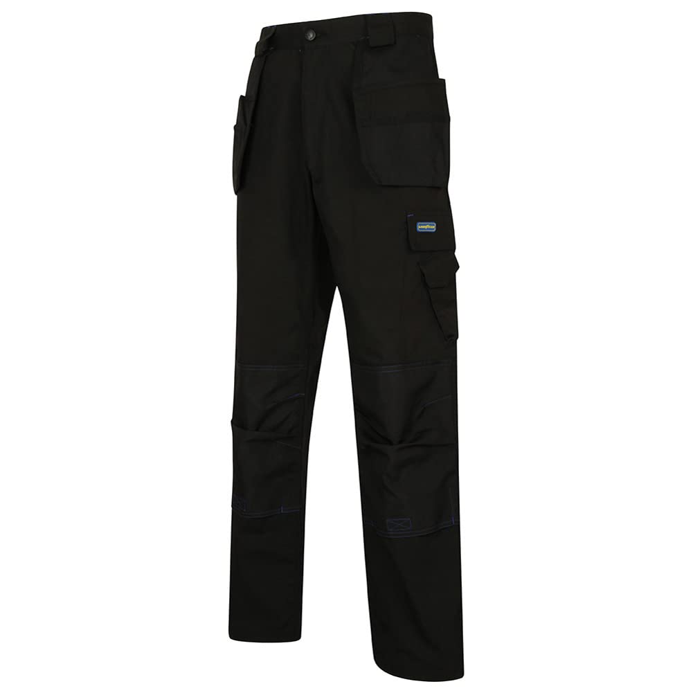 - Eine Goodyear Arbeitshose mit festen Holstertaschen und von unten zugänglichen Kniepolstertaschen.
