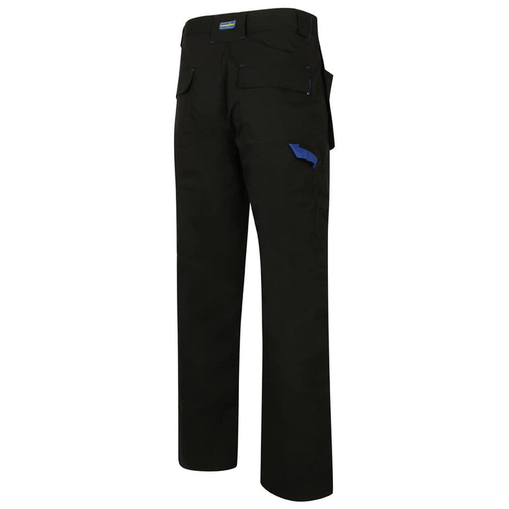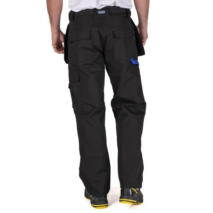 - Eine Goodyear Arbeitshose mit festen Holstertaschen und von unten zugänglichen Kniepolstertaschen.