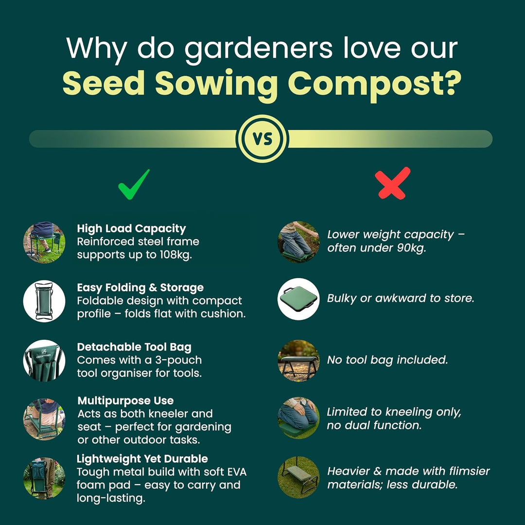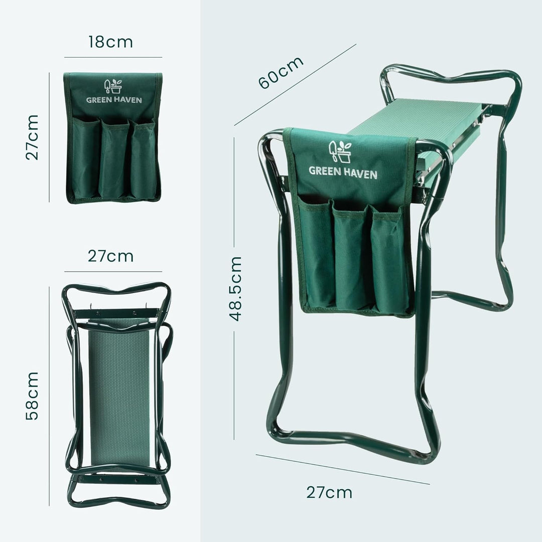 - Unsere Gartenhocker-Kniebank ist mit einer Werkzeugtasche mit 3 Beuteln ausgestattet, unsere Kniepolster für die Gartenarbeit sorgen dafür, dass Ihre Gartengeräte immer in Reichweite sind. Die Tasche kann in knienden und sitzenden Positionen montiert