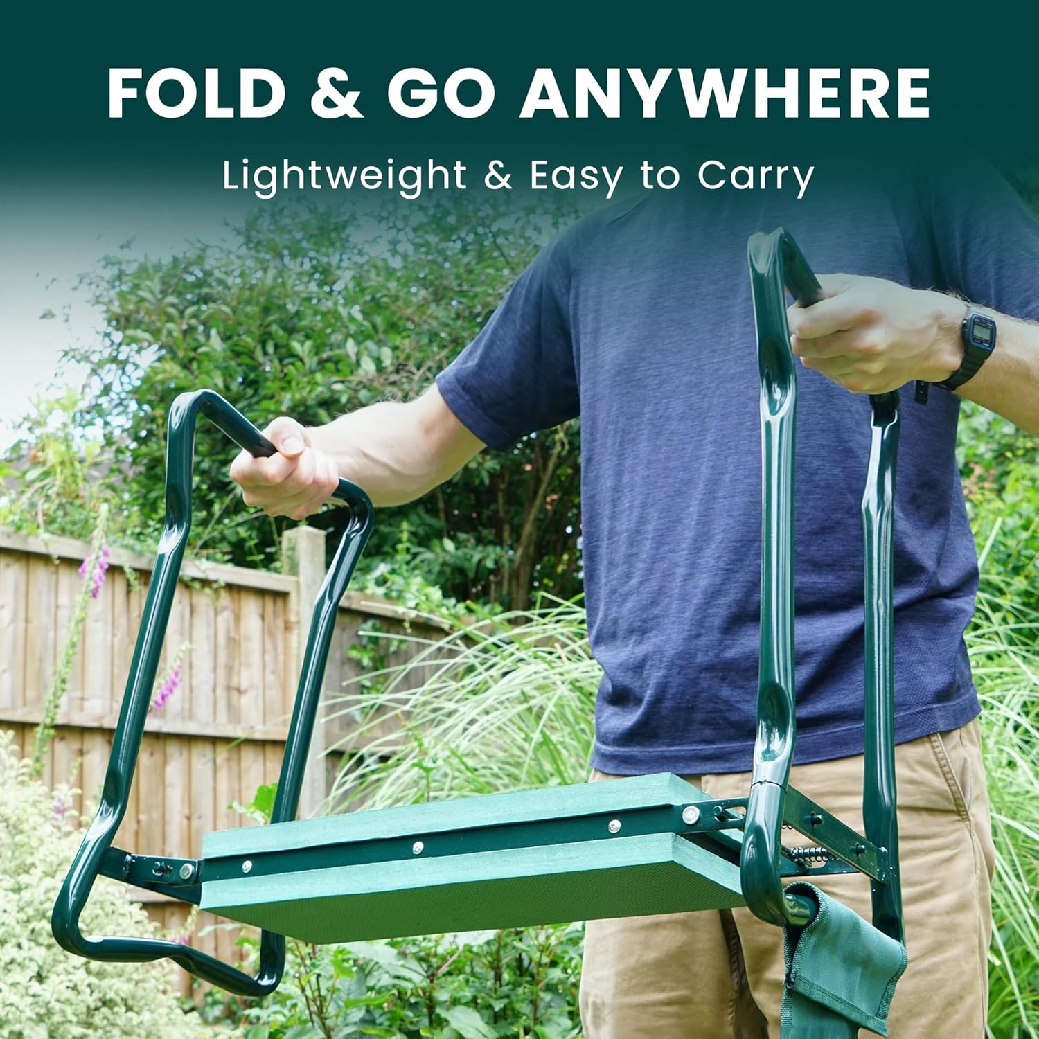 - Der Kniehocker Klappsitz lässt sich zur bequemen Aufbewahrung leicht in eine kompakte Grösse zusammenklappen. Ziehen Sie einfach den Lenker vom Schaumstoffpolster weg und klappen Sie die Beine unter, sodass dieser Garten-Kniehocker flach mit dem Kissen
