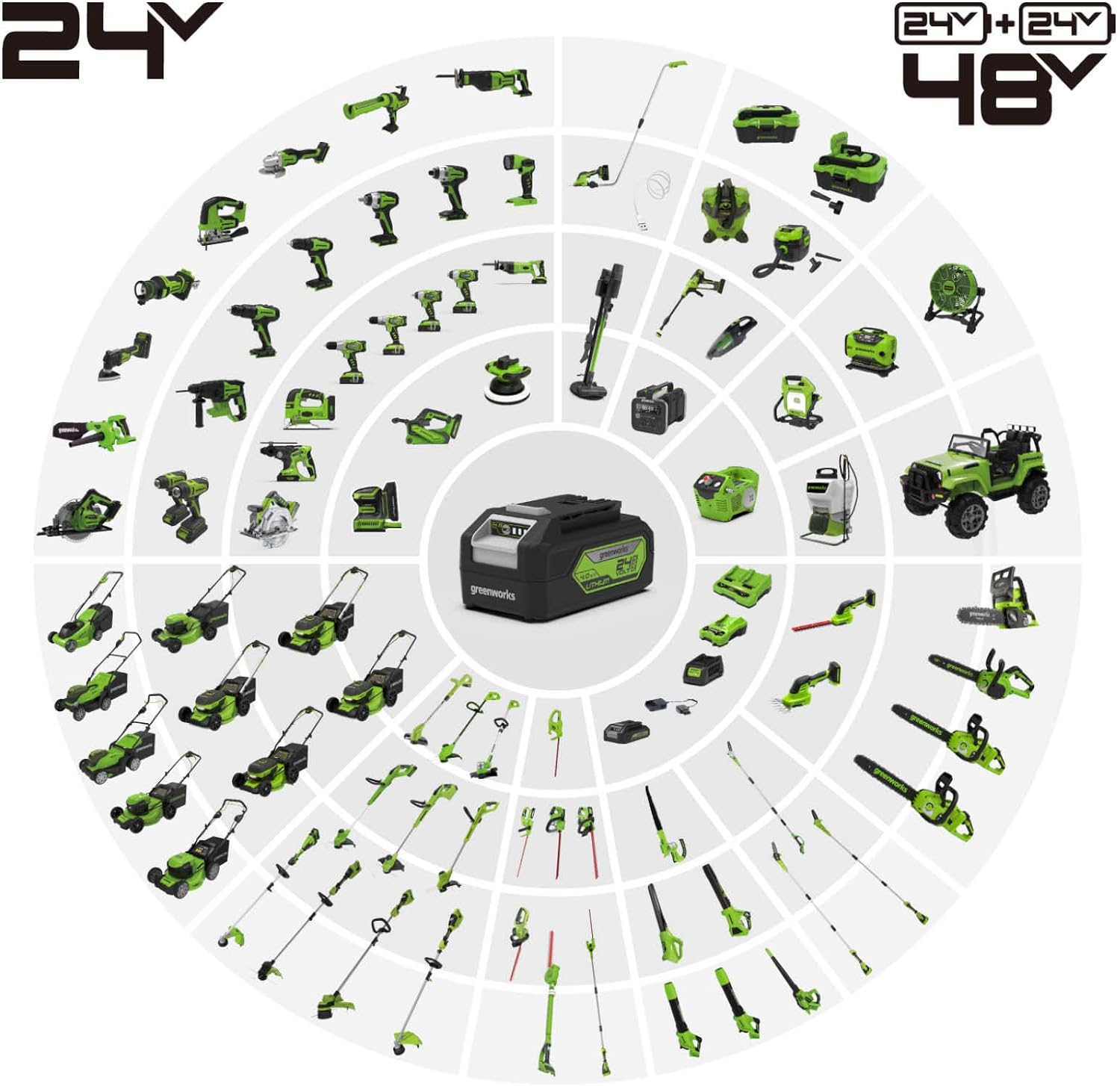 - EIN AKKU FÜR ALLE - die Greenworks 24V Akkus von 2Ah bis zu leistungsstarken 4Ah sind vielseitig einsetzbar & mit vielen Produkten aus dem Haus Greenworks im Bereich Garten & Werkstatt kompatibel