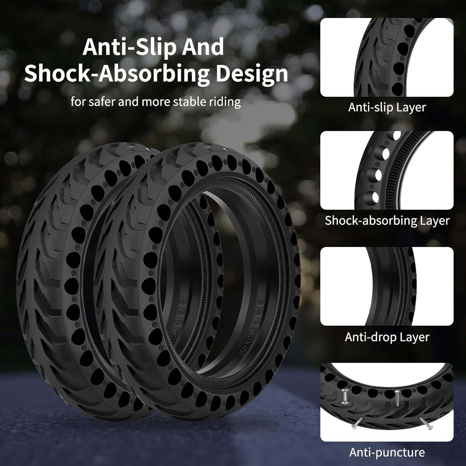 - Sicherer und zuverlässiger Scooter Reifen: Dieser explosionsgeschützte und pannensichere Vollgummireifen muss nicht aufgepumpt werden, sodass Sie sich keine Gedanken über das Risiko von Reifenpannen und platten Reifen machen müssen. Das Design der