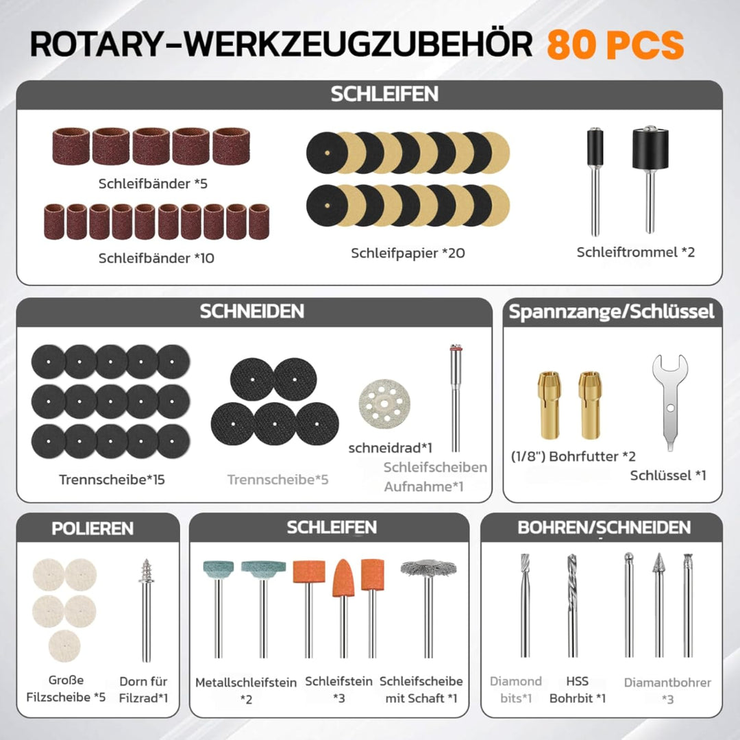 - 【80-teiliges Zubehör für Rotationswerkzeuge】 Dieses kabellose Multifunktions-Rotationswerkzeug-Set enthält 80 praktische Zubehörteile – darunter Schneidscheiben, Schleifscheiben, Bohrer, Schleifpapier und mehr. Die 1/8-Zoll-Spannzange ist mit