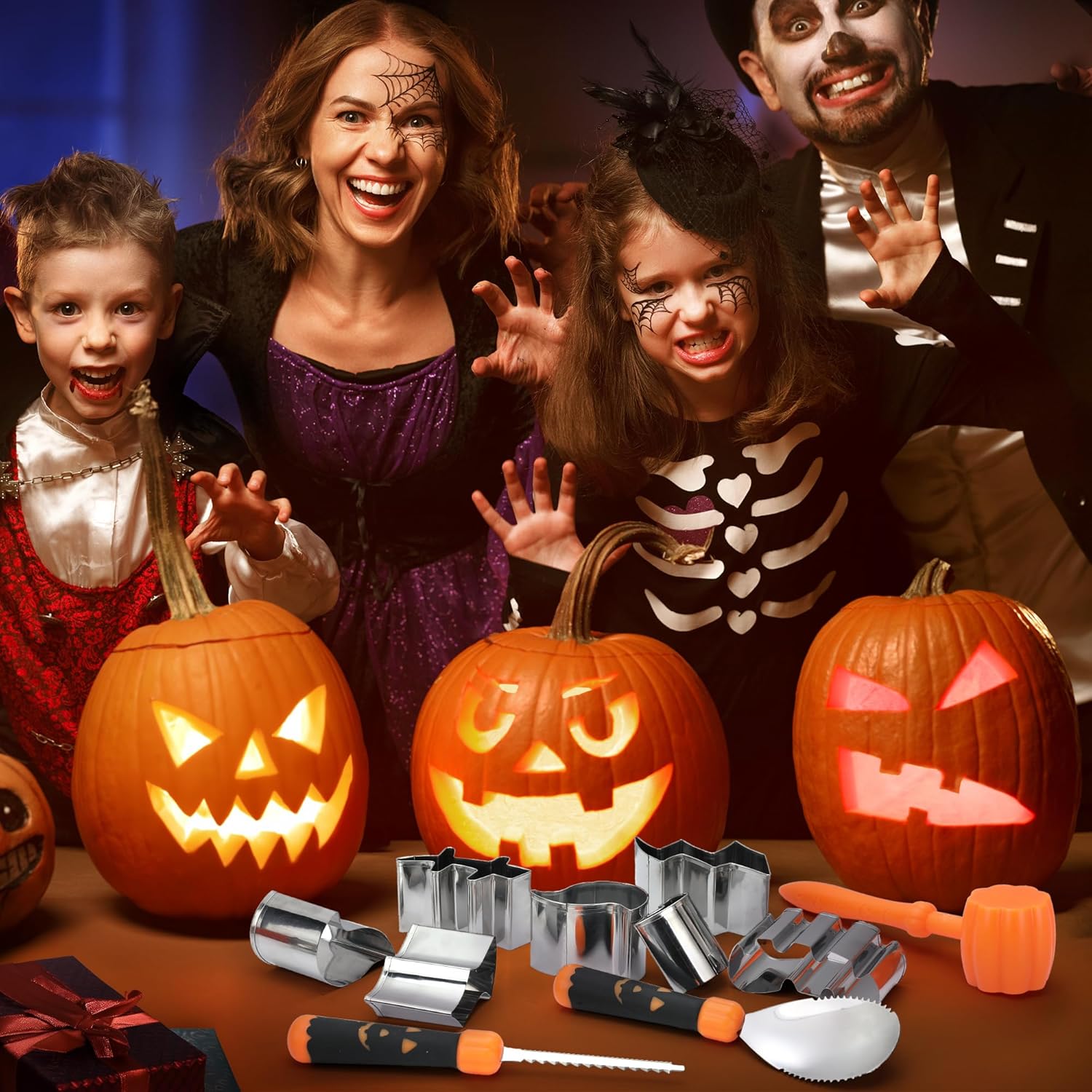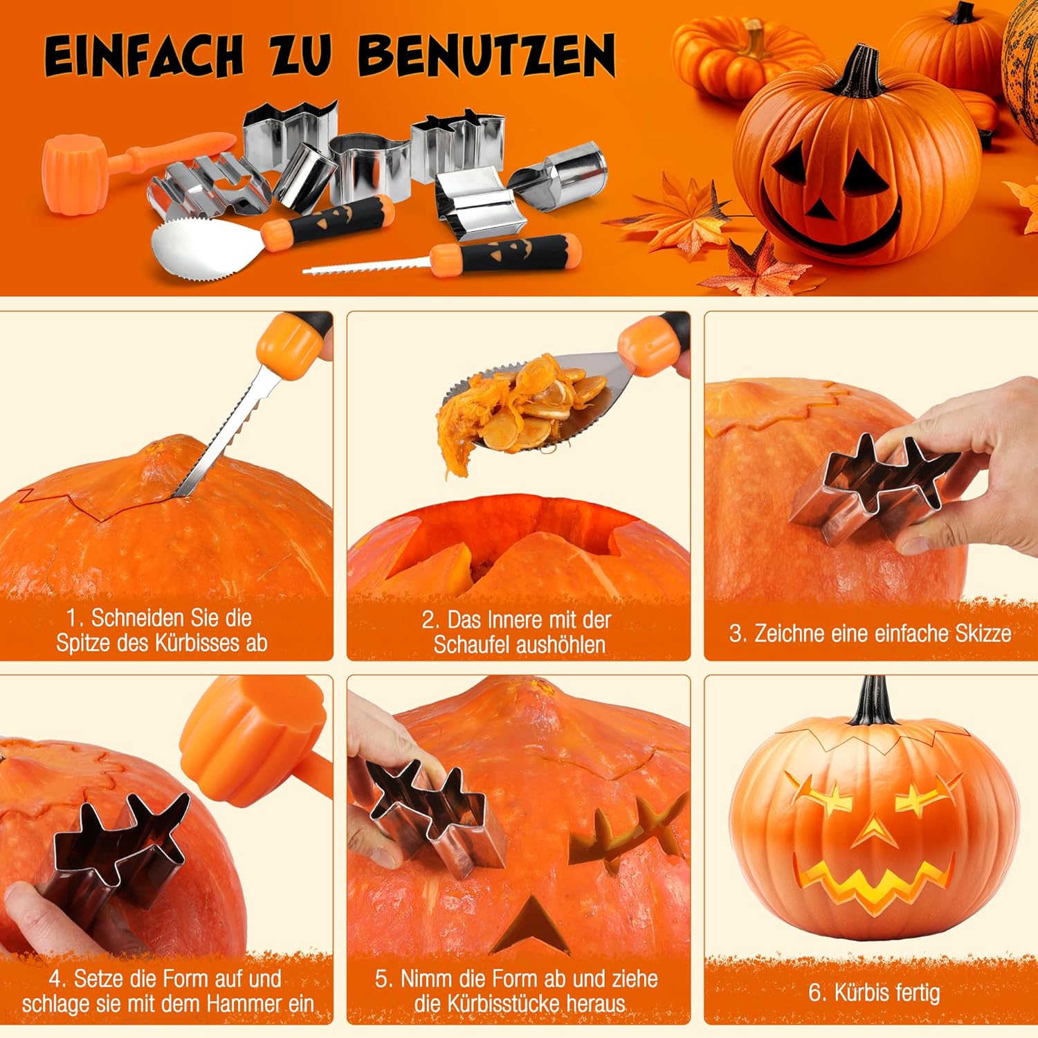 - 23 STÜCK SCHNITZWERKZEUG SET: 1 × Grabschaufel, 1 × Doppelseitige Rausäge, 20 × Gespenstische Formen, 1 × Hammer, mit denen Sie ganz einfach eigene Kürbislichter machen können
