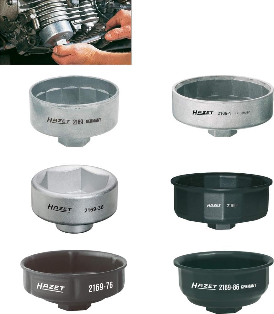 - LIEFERUMFANG: 1x HAZET 2169-6 Öl-Filter-Schlüssel I Durchmesser 97 mm, Aussen 16-kant Abtrieb Schlüsselweite: 86 mm, Vierkant Antrieb 12,5 mm, Antriebs-6-kant Schlüsselweite: 24 mm, Gewicht 0,29 kg