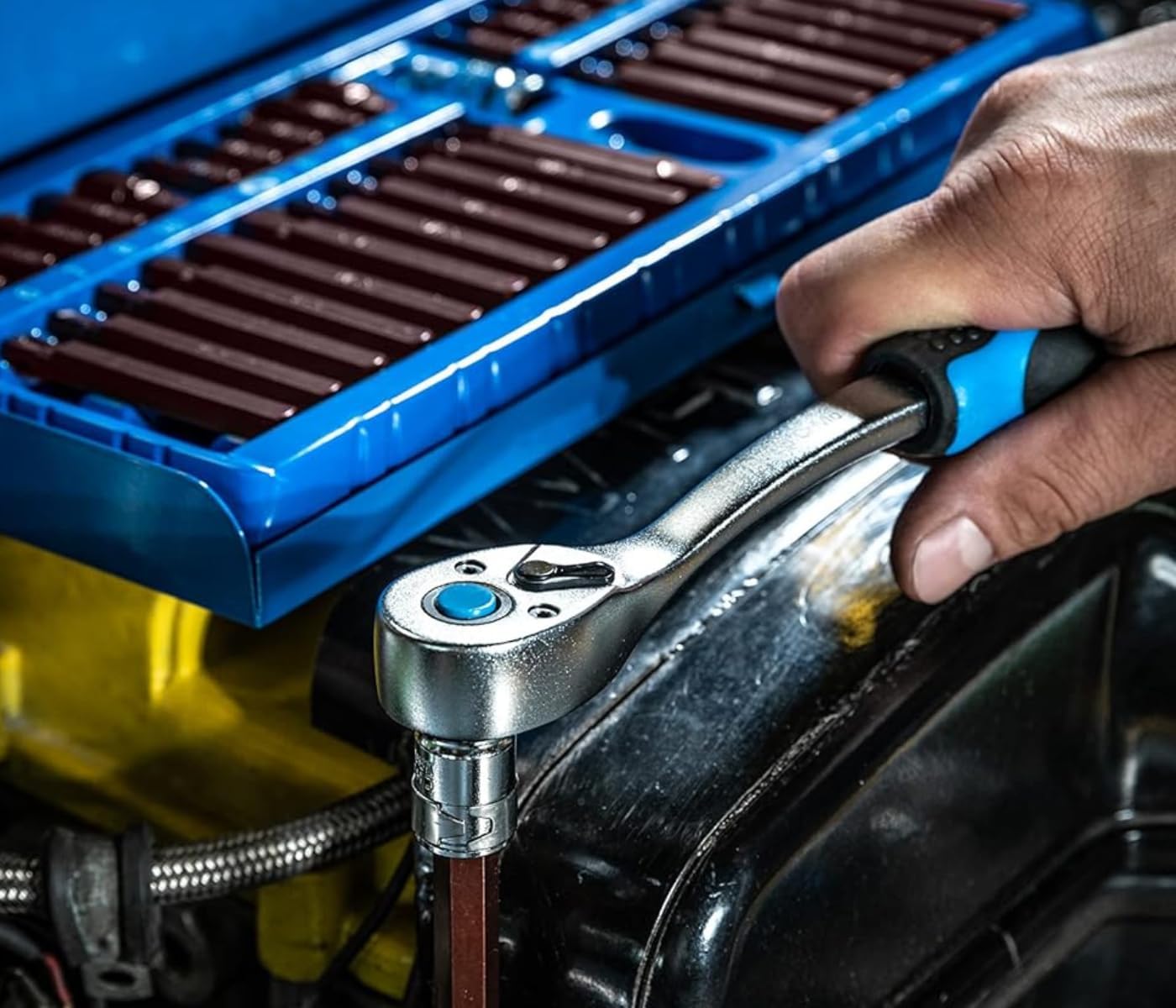 - Hochwertige Materialien: Der Steckschlüsselsatz besteht aus robustem Chrom-Vanadium-Legierungsstahl für den Werkzeugkörper und hochwertigem Chrom-Molybdän-Legierungsstahl für die präzisionsgefertigte Ratsche. Diese Materialien gewährleisten