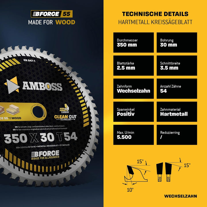- ✌ Dein optimales Sägeblatt für Holz - Allround - Ø 350 x 3.5/2.5 x 30 Z 54 WZ - geeignet für Tischkreissäge. Der Fokus unserer Bforce 55 liegt auf der professionellen Holzbearbeitung zum attraktiven Preis ohne Kompromisse bei der Qualität.