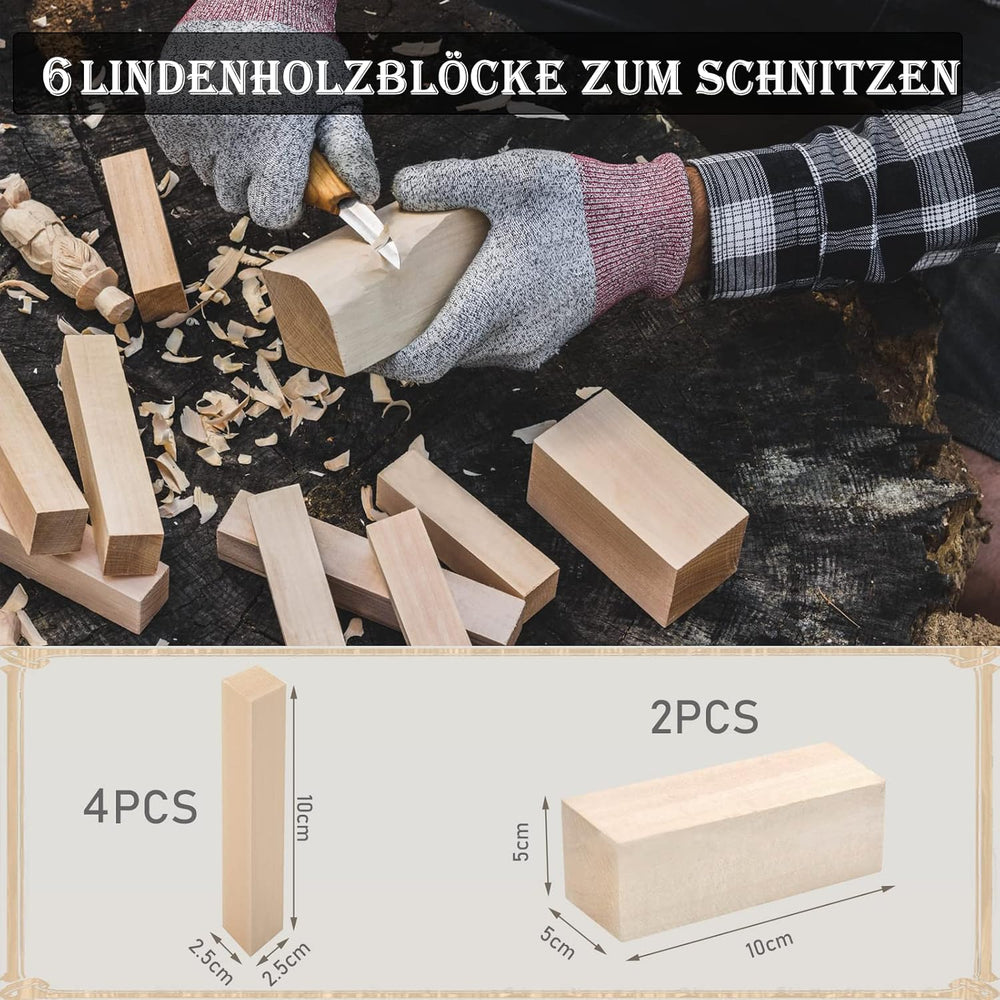 - [24 in 1 Schnitzset] Dieses Schnitzset enthält 3*Schnitzmesser (grobe Schnitzerei), 4*Schnitzmesser (feine Schnitzerei), 4*kleine Holzklötze (2,5*2,5*10cm), 2*grosse Holzklötze (5*5*10cm), 4*Schleifpapier (180/320/600/800), 1*Polierband, 1*Ölwachs,