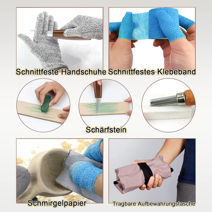 - ✅ [Sicherheit im Gebrauch] Für die Sicherheit im Gebrauch haben wir Ihnen 1* schnittfestes Klebeband und 1* schnittfeste Handschuhe beigelegt, ausserdem hat jedes Schnitzmesser eine durchsichtige Schutzhülle, um Ihre Sicherheit zu gewährleisten.
