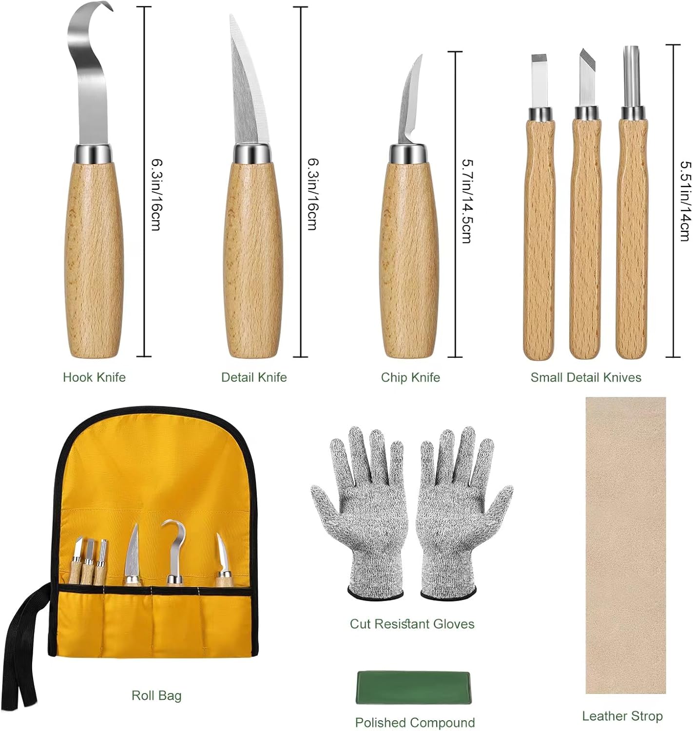 - ⭐【10 Komplettes Holzschnitzset】 Das professionelle Holzschnitzwerkzeuge Set für Anfänger enthält 3 Schnitzmesser, 3 detaillierte Holzschnitzmesser, 1 Paar schnittfeste Handschuhe, Lederriemen, Polierpaste und eine tragbare Werkzeugrolltasche zur