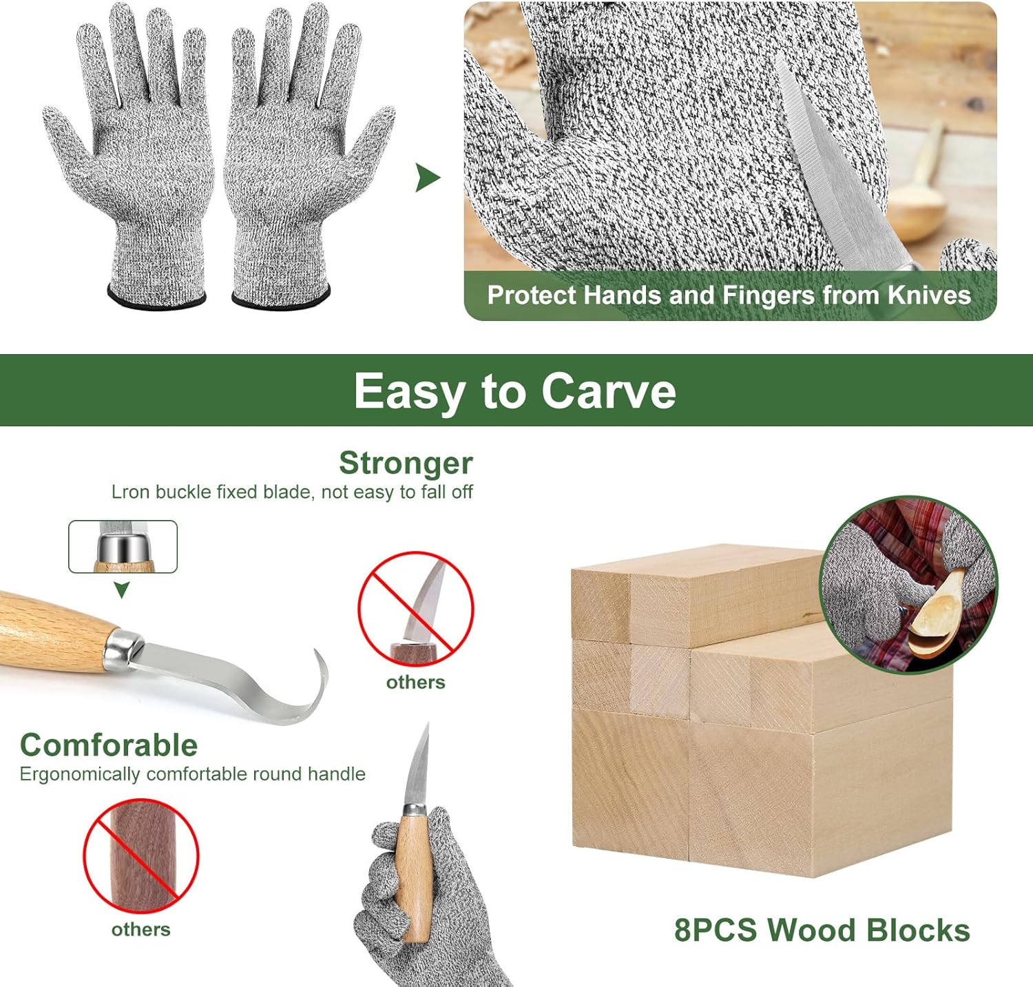 - 💯【Perfektes & leichtes Set-Matching】Jedes Holzschnitzset wird mit einer tragbaren, aufrollbaren Aufbewahrungstasche für einfache Lagerung und Transport geliefert. Schnittfeste Handschuhe schützen Ihre Hände vor Schnitten und Kratzern.