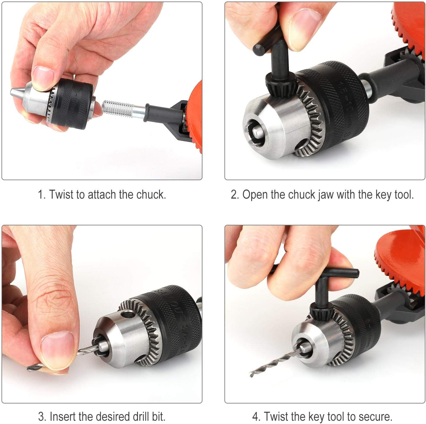 - EINFACHE INSTALLATION: Wenn man Spannfutter und Bohrer installiert, braucht man nur drehen und schrauben. Der Spannschlüssel hilft Ihnen dabei, den oberen Teil des Spannfutters mühelos zu drehen, um Bohrer zu wechseln.