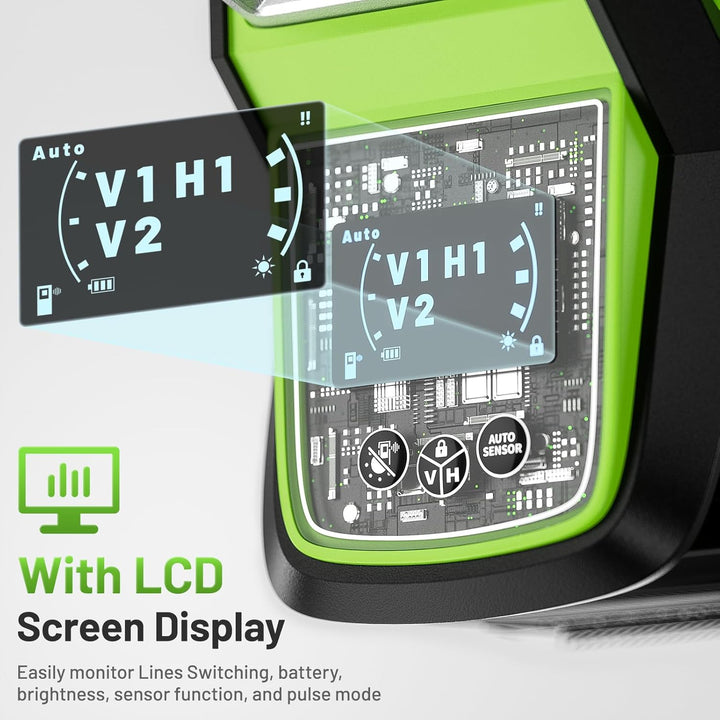 - LCD-Display: Die Laser-Wasserwaage verfügt über ein LCD-Display, auf dem Sie den Status der Laserlinien, Helligkeit, des automatischen Sensors, der Batterie, des Pendels und des Pulsmodus ganz einfach auf dem Display sehen können. Die Informationen