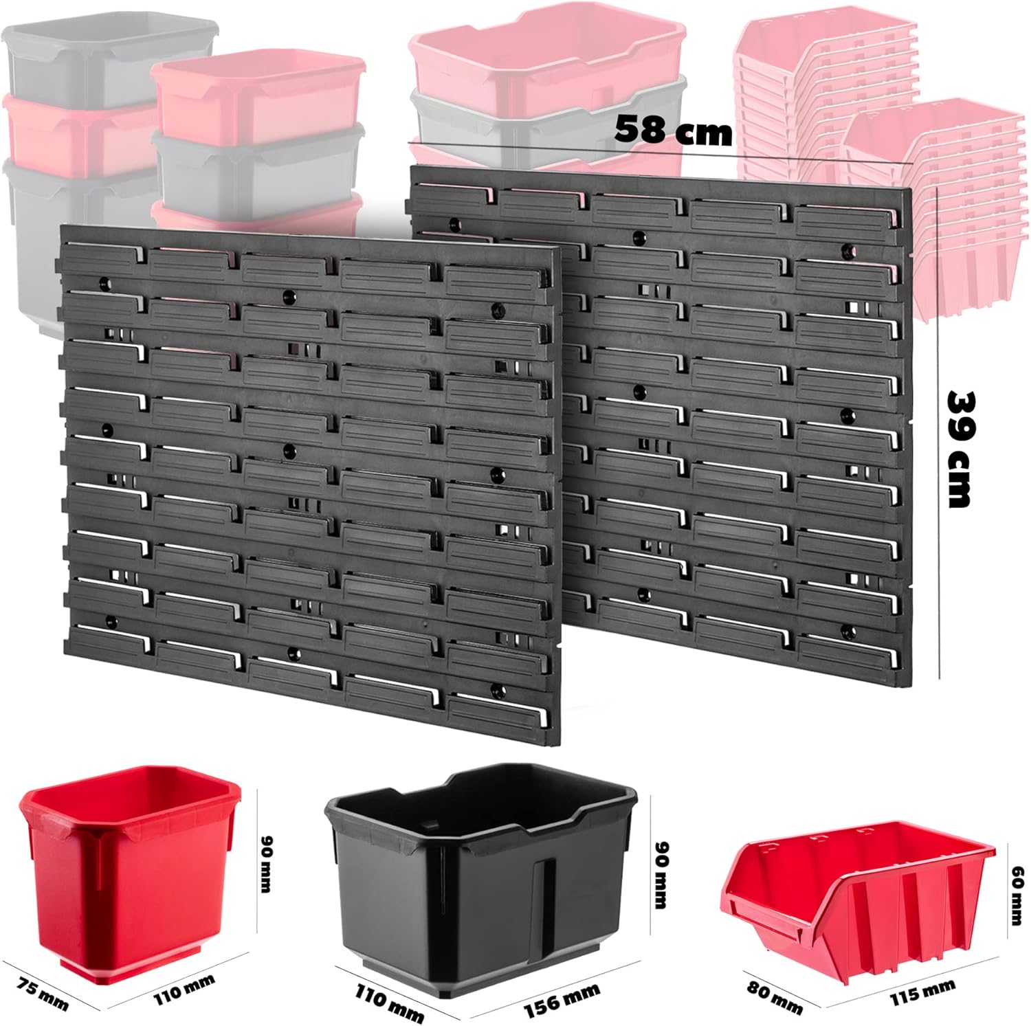 - Das Set enthält: 2x Werzeugswand 58x39cm, 14x rote Sichtlagerkasten 11,5x8x6cm , 1x Werkzeughaken-Set, 2x Werkzeugträger 38,4x11,1x2cm, 6x Aufbewahrungsbecher 11x7,5x9cm, 4x Aufbewahrungsbecher 15,6x11x9cm.