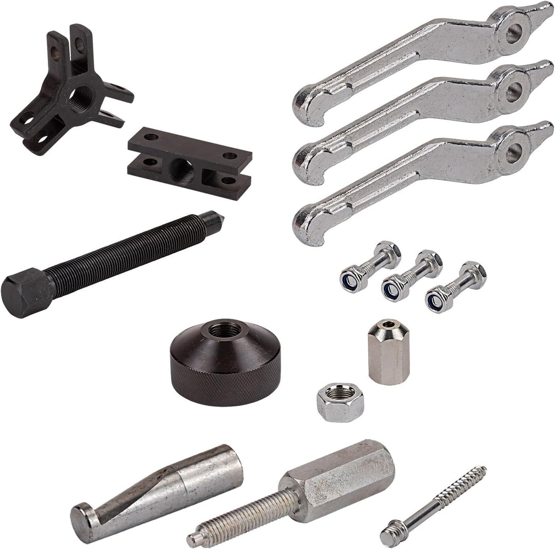 - 1x Vorrichtung für 2 Arm Abzieher für innen und aussen, 1x Vorrichtung für 3 Arm Abzieher für innen und aussen, Abzieher AussenØ min.: 40 mm max.: 180 mm, Abzieher InnenØ min.: 80 mm max.: 170 mm, Abzieher Armlänge 90 mm, Gewinde Adapter 7/16"-16