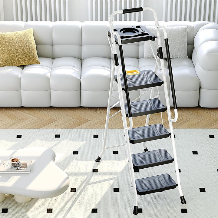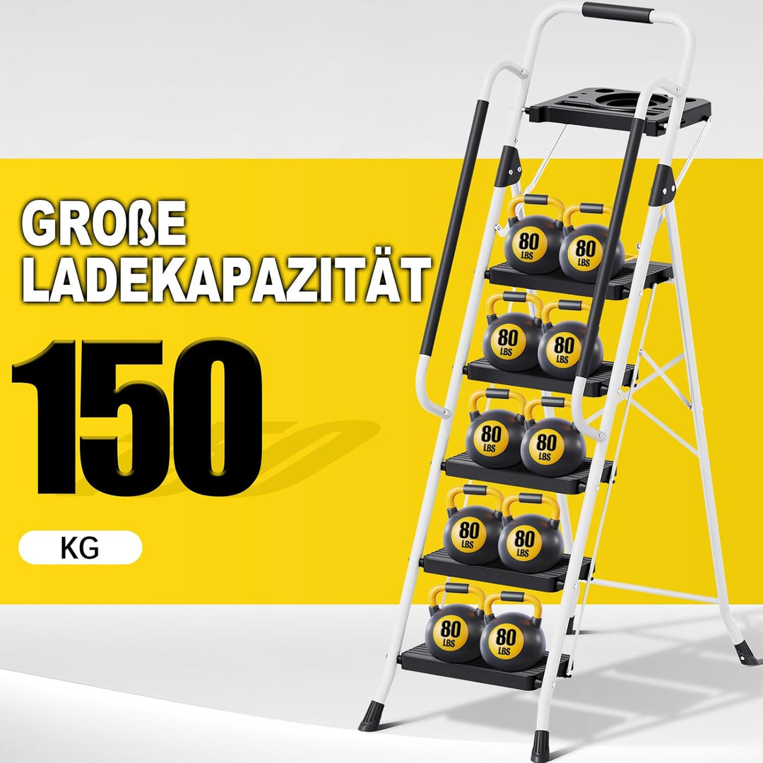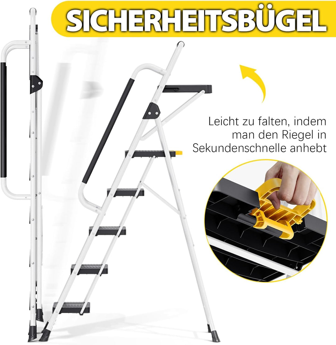 - Ergonomischer Sicherheitsschloss: Unserer 5-stufigen klappbaren Haushaltsleiter enthält einen benutzerfreundlichen Sicherheitsschloss, der gut in der Hand passt und einfaches Zusammenklappen und sicheres Schliessen gewährleistet. Geniessen Sie maximale