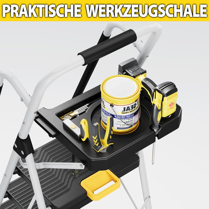 - Multifunktionaler Werkzeugtray: Die leiter 4 stufen bietet eine geräumige, multifunktionale Werkzeugplattform, auf der Sie bequem Gegenstände wie Handschuhe, Schraubenschlüssel, Farbeimer und Glühbirnen lagern können. Dieses Design reduziert die