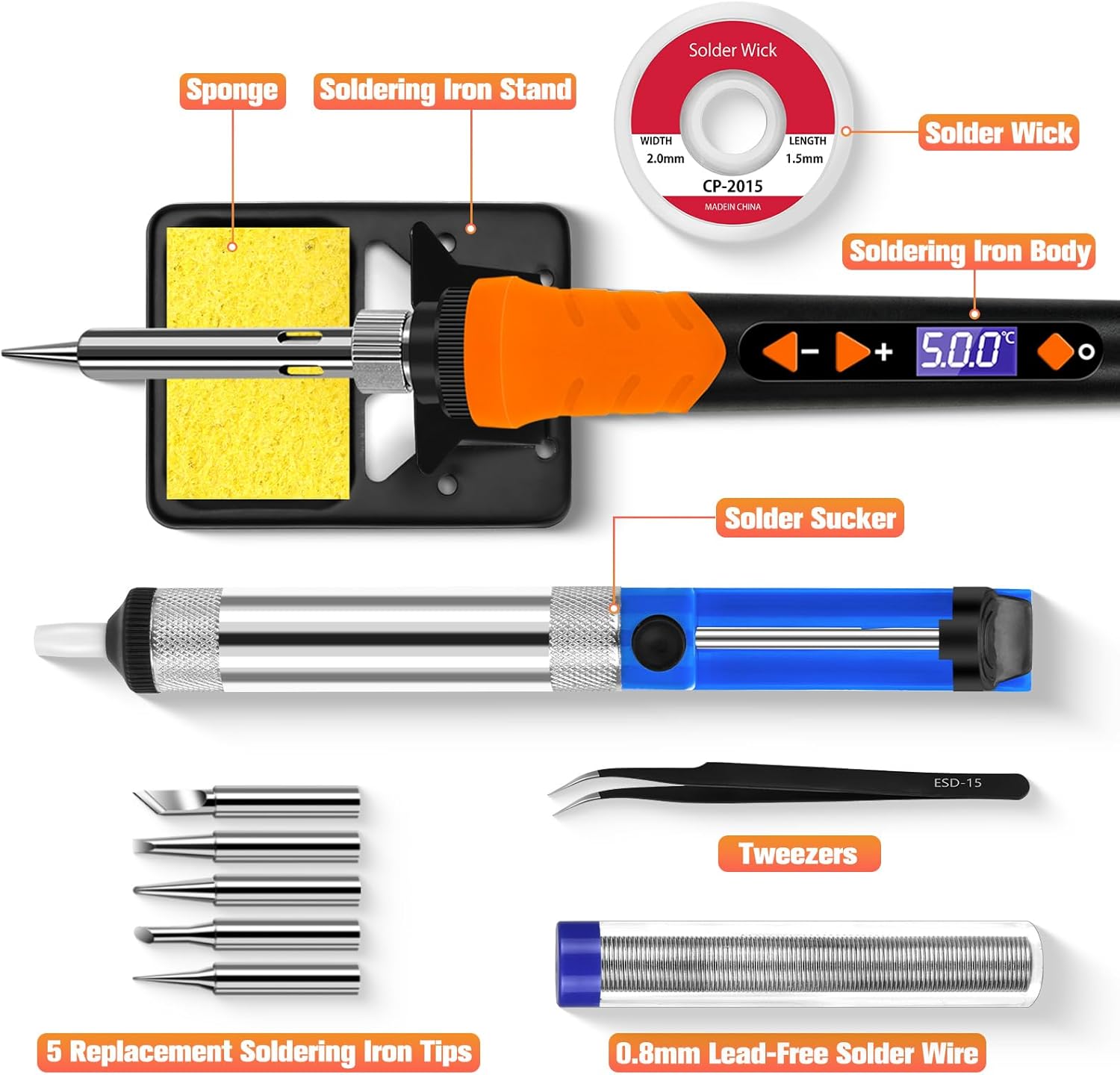 - 【12-in-1 Umfangreiches Lötset】Lötkolben-Set: Lötkolben, 5 * austauschbare Lötkolbenspitzen, Lötdraht, 0,8 mm bleifreier Lötdraht, Entlötpumpe, Lötkolbenständer, Schwamm, Pinzette, Bedienungsanleitung, Werkzeugkasten.Ein personalisierter