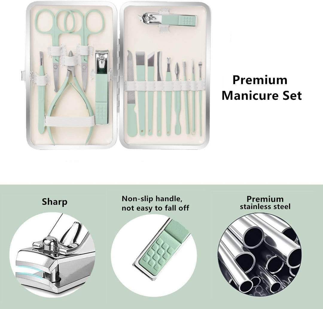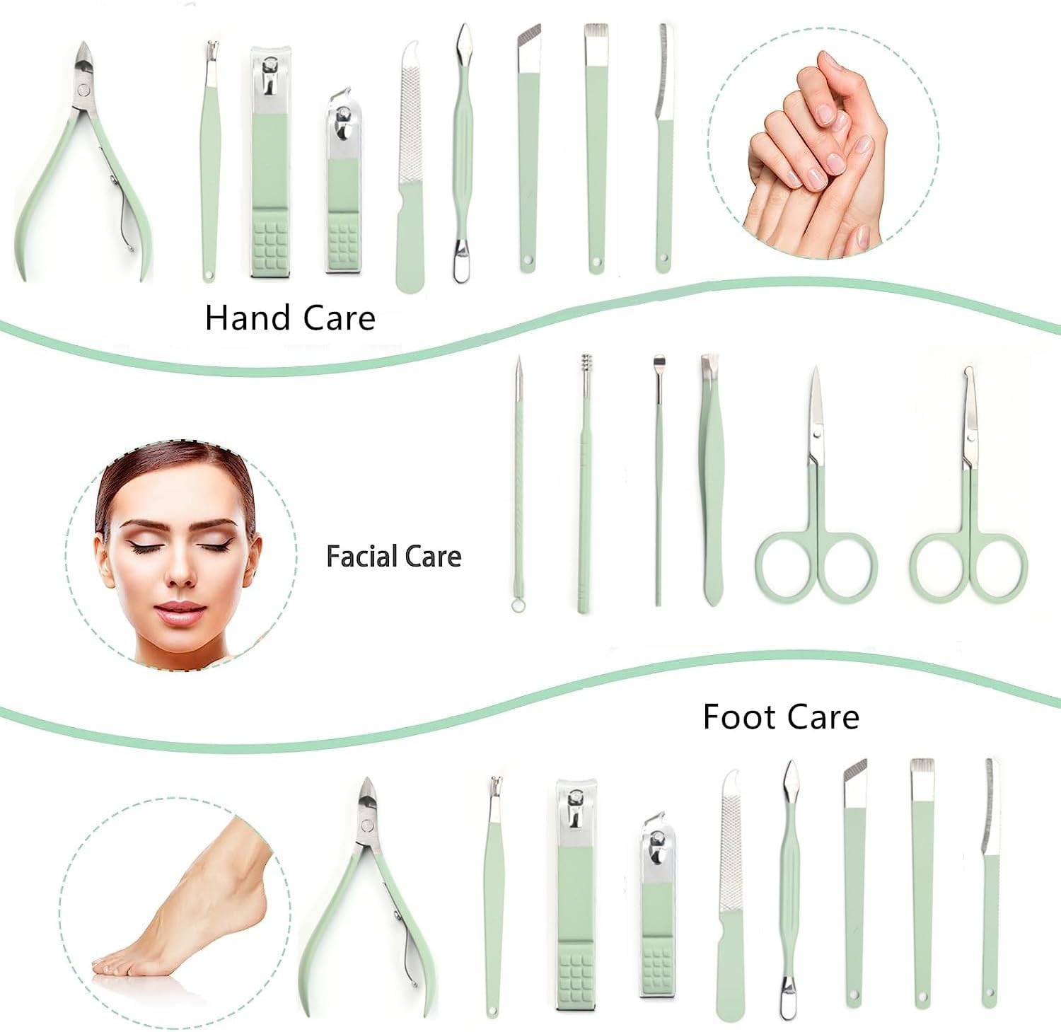 - [ Professionelle Schönheits- und Körperpflege-Werkzeuge: Maniküre-Satz enthält 15 Werkzeuge (grosse Nagelschneidemaschine, kleine schräge Nagelschneidemaschine, Nasenhaarschere, Augenbrauenschere, Augenbrauenppinzette, Spiralohrstocher, Ohrstocher,