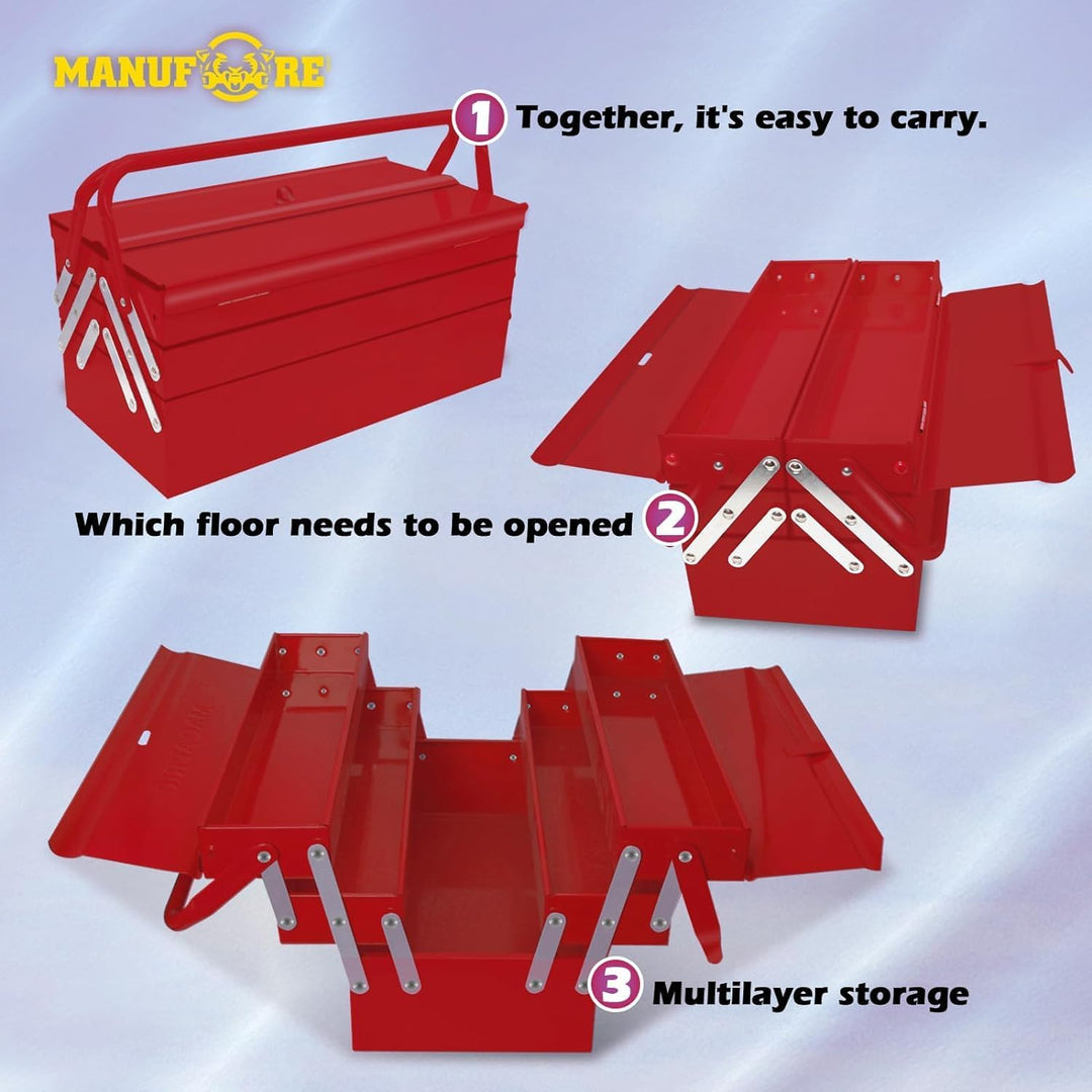 - 【Bequem】Der Werkzeugkasten ausklappbar enthält 3 ebenen und insgesamt 5 fächer. Die aufteilung der fächer erleichtert die sortierung der werkzeuge und ermöglicht es ihnen, die benötigten werkzeuge im werkzeugkasten schnell zu finden, wenn sie