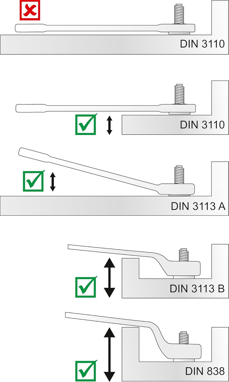 - DIN 3113 Form A / ISO 3318 / 7738, Drehmomentwerte weit über DIN für zusätzliche Sicherheit