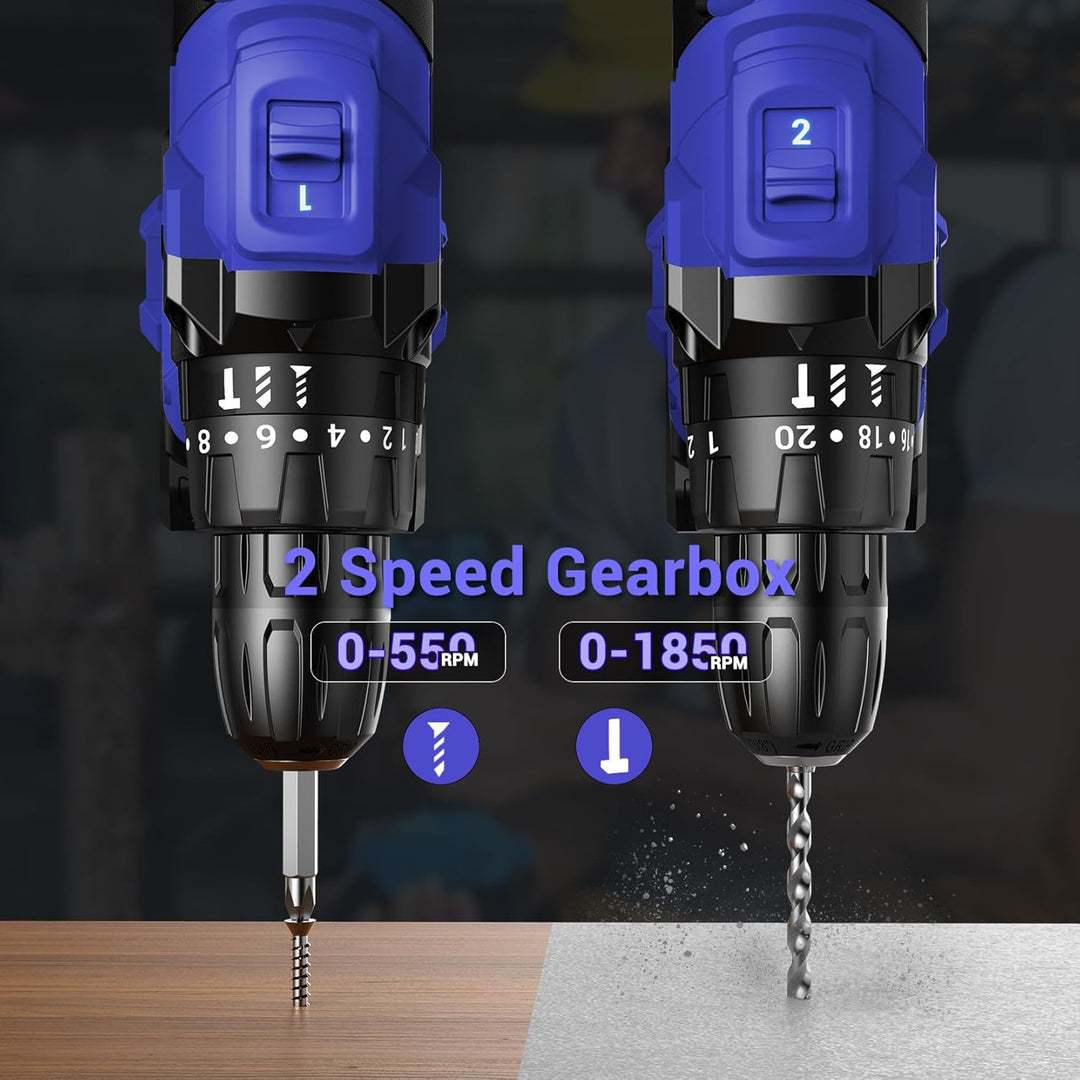 - 【Geschicktes Design, Selbstverriegelndes Bohrfutter】-Der Akkuschrauber wiegt nur 1,2 kg und ist leicht zu tragen. Der komfortable, stossfeste Griff reduziert effektiv die Ermüdung bei der Arbeit. Mit dem rutschfesten, gummibeschichteten,