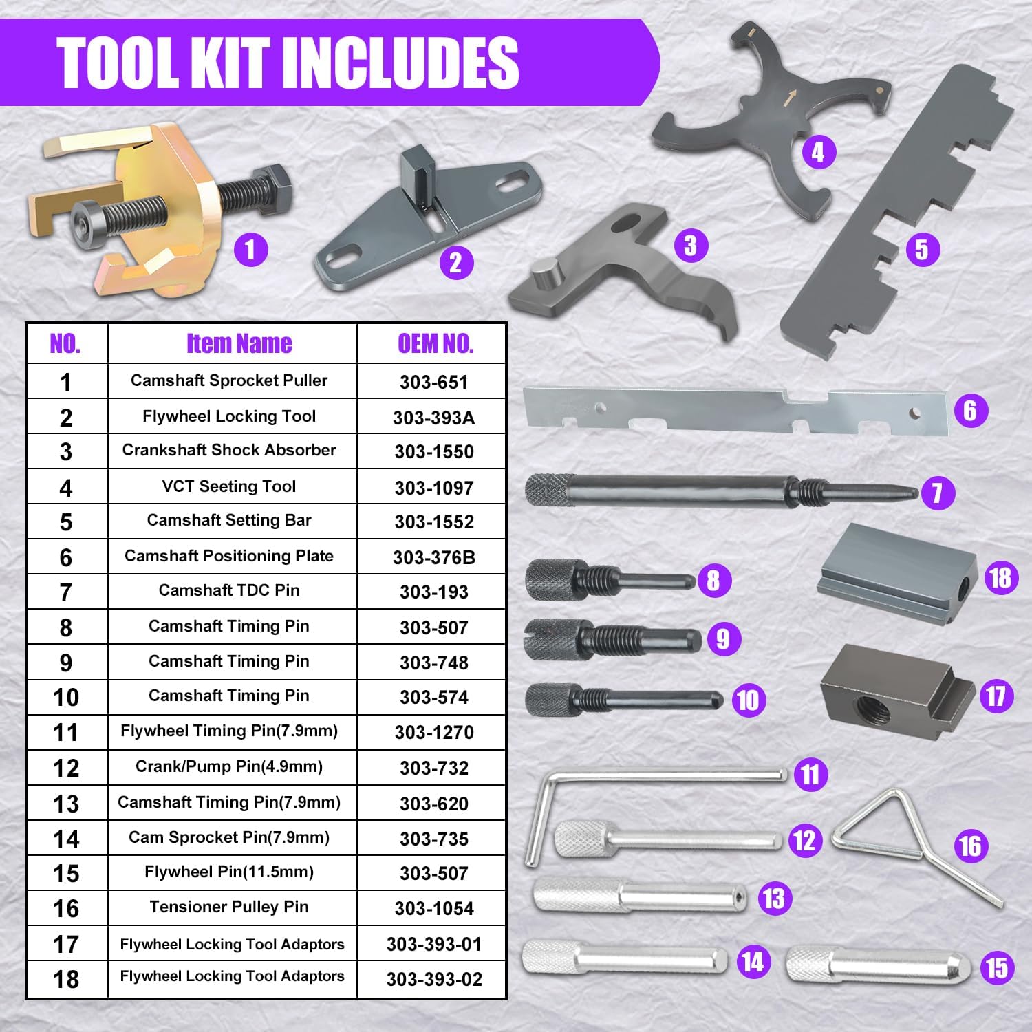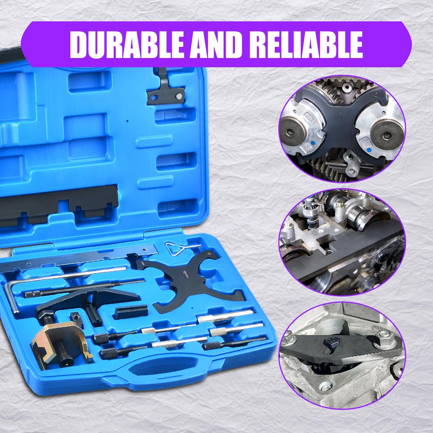 - FUNKTION: Das Nockenwellen-Ausrichtungs-Werkzeugset dient zum Arretieren und Ausrichten der Nockenwelle, der Kurbelwelle und des Zahnriemenspanners in der richtigen Steuerposition sowie zum Einstellen des VTC-Geräts.